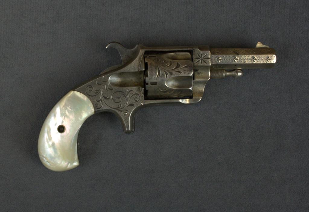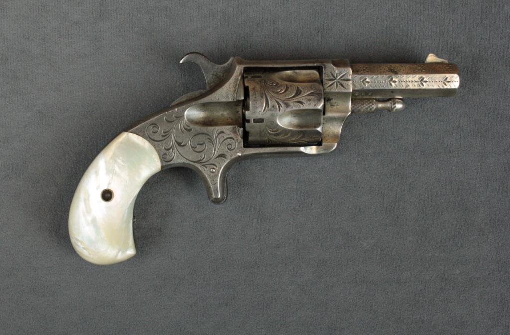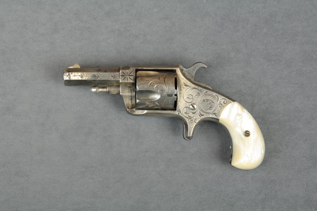 Hopkins & Allen XL No. 5 Safety Lock spur trigger revolver, .38 cal., traces of silver plating remaining, period engraved, beautiful pearl grips, #NVSN. This deluxe gun is in overall fine condition showing period silverwash finish in protected areas, fine action, bore and markings, fine iridescent pearl grips, New York style engraving including a panel scene on the left frame of a cat. Est.: $600-$1,200.