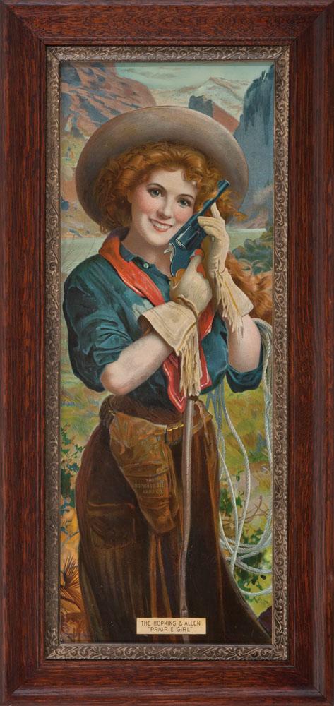 Original lithograph advertising for the Hopkins and Allen firearms company. Colorful image of beautiful cowgirl showing off her revolver. 26” x 9 1/2” image framed in vintage frame to 31 1/4” x 14 3/4” Unaltered with some surface damage and cracking. Colors are bright.