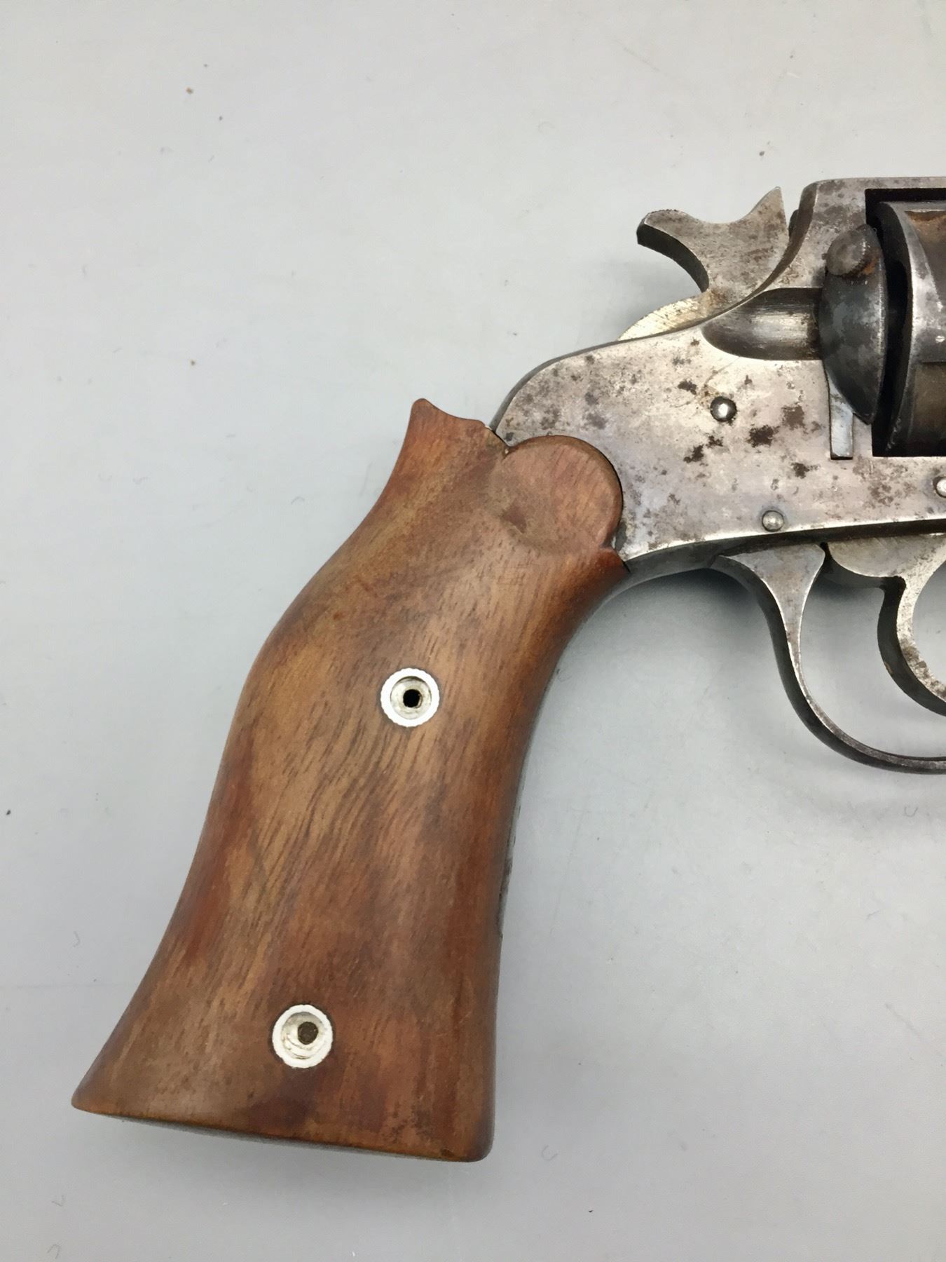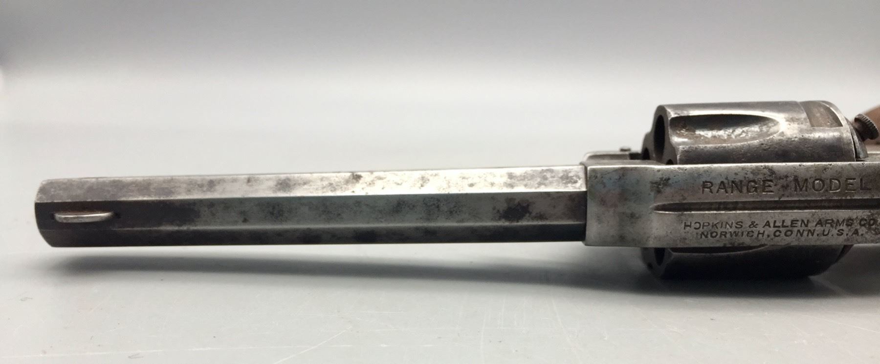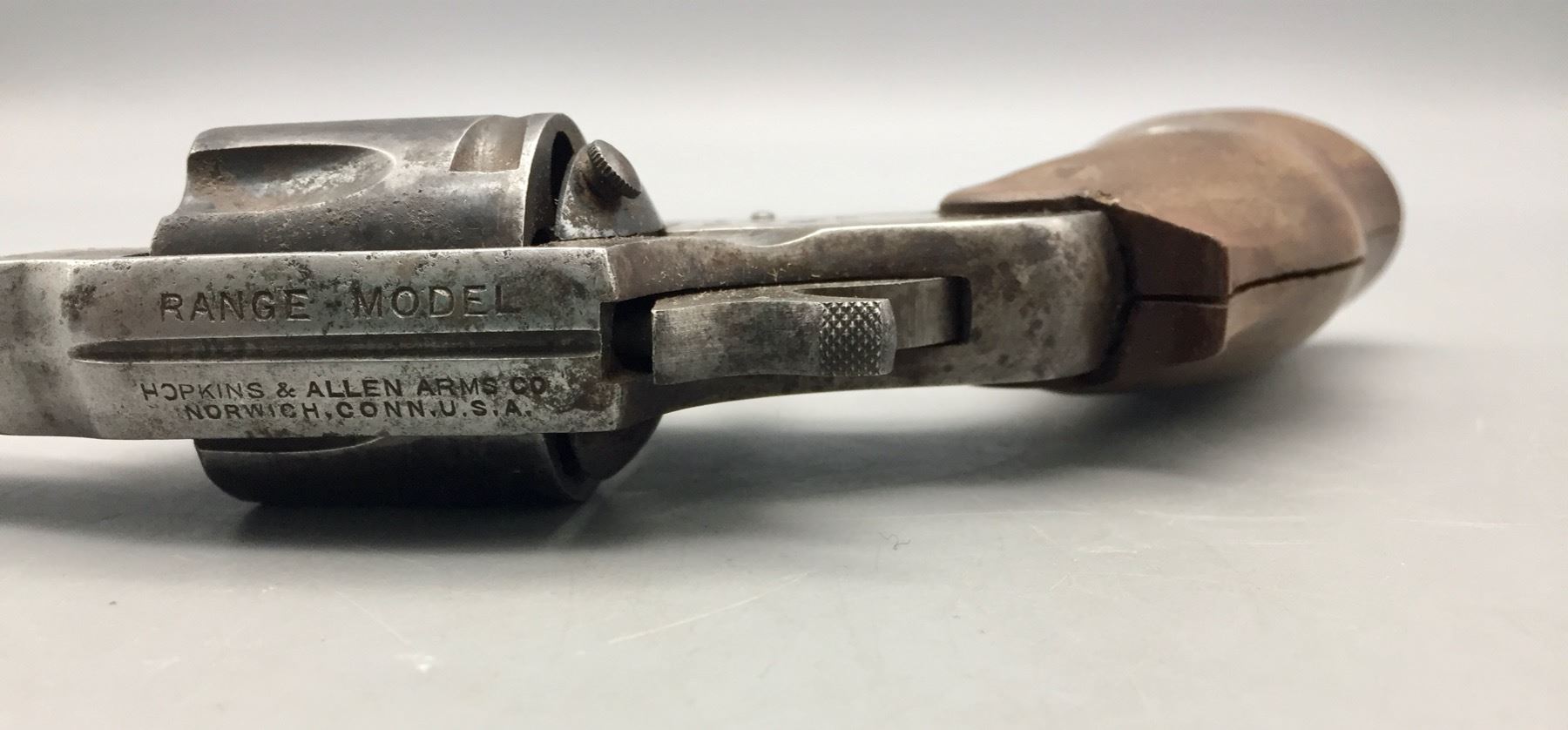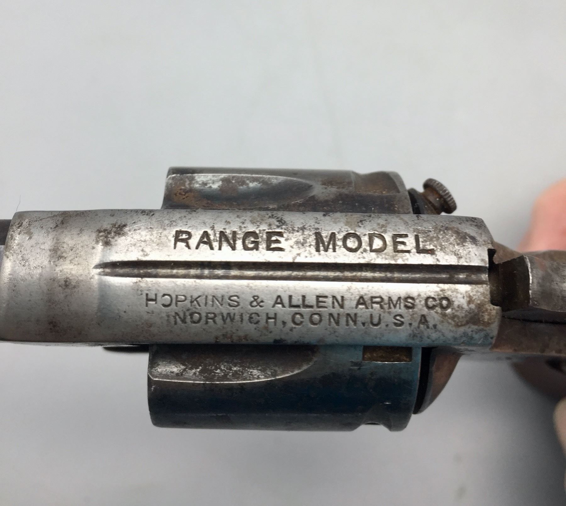 Description: Offered for sale in this lot is an Hopkins and Allen Arms Co., Range Model revolver. Appears to be about a .32 caliber. Maker: Hopkins and Allen Arms Co. Approx. Age: Early 1900s. Serial No. 7341. Size: Barrel measures 4-1/2†with an overall length of 10-1/2â€. Condition: Pretty good for its age, normal wear expected. Missing one grip screw. Please look closely at the pictures - they are an important part of our description. Shipping: There will be a $15 handling / packaging fee for shipping this lot. The actual cost of postage will be added on top of that. *****This firearm REQUIRES an FFL Transfer*****