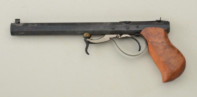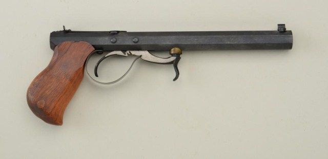 Hopkins and Allen single shot underhammer percussion pistol, .36 cal., 6” octagon barrel, mat black finish, wood grip, #91260. This gun is in overall fine condition showing the majority of its original finish, crispaction, bore and grips. Est.: $50-$100.