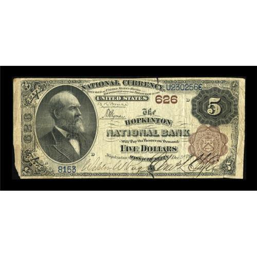 <B>Hopkinton, MA</B></I> - $5 1882 Brown Back Fr. 467 <B>The Hopkinton NB</B></I> Ch. # 626<BR> This is a bright example from this tougher to locate issuer. Bright surfaces remain while a slight paper pull at right and missing corner at left do not distract. <B>Fine</B></I>.<BR><BR><b>Shipping:</b> Coins & Currency (<a target="_blank" href="http://www.heritageauctions.com/common/shipping.php">view shipping information</a>)