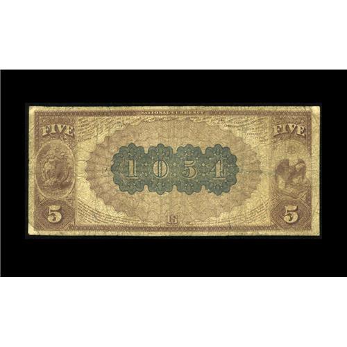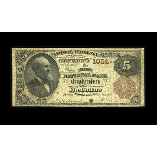 <B>Hopkinton, RI</B></I> - $5 1882 Brown Back Fr. 467 <B>The First NB </B></I> Ch. # 1054<BR>This was the only issuer located in this Washington County locale. It ceased operating in 1914 and is quite an elusive bank to locate. We sold an EF-AU $10 1902 Date Back from here in our 2004 Central States auction in Milwaukee for $1,092.50.. This well circulated but damage free <B>Very Good</B></I> still retains the officers' ink signatures and is scarce enough that it should sell for about...
