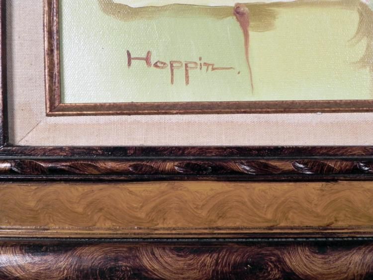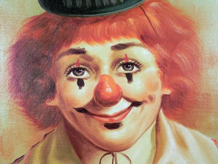 This clown looks happy with his warm smile, red orange hair, and little funny hat. * * * Artist: Hoppin Signature: Lower left Medium: Acrylic on canvas Image size: 11 1/2 x 15 1/2 inches Framing: In two tone wood frame with linen and gold painted inner border Frame size: 20 x 24 inches Condition: Excellent