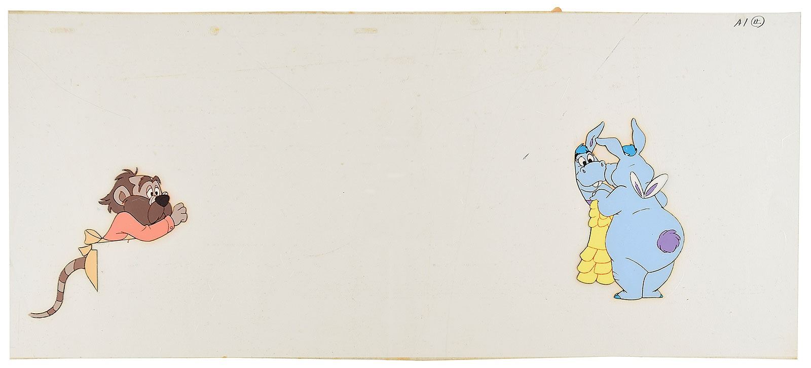 (Walt Disney Studios, 1985) Original production cel featuring Hoppopotamus from The Wuzzles, showing her trying on a yellow dress. Hoppopotamus measures 3 x 4.75 and the other Wuzzle measures 4 x 3.5, with overall dimensions of 20.75 x 9. In very good to fine condition, with some irregular spotting and dimpling to the celluloid.