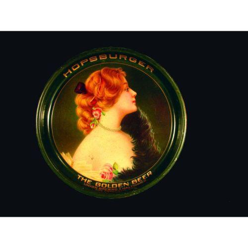 Hopsburger Golden Beer Tin Serving Tray, San Francisco, CA, some minor scratches otherwise very good condition, 13 inch diameter.