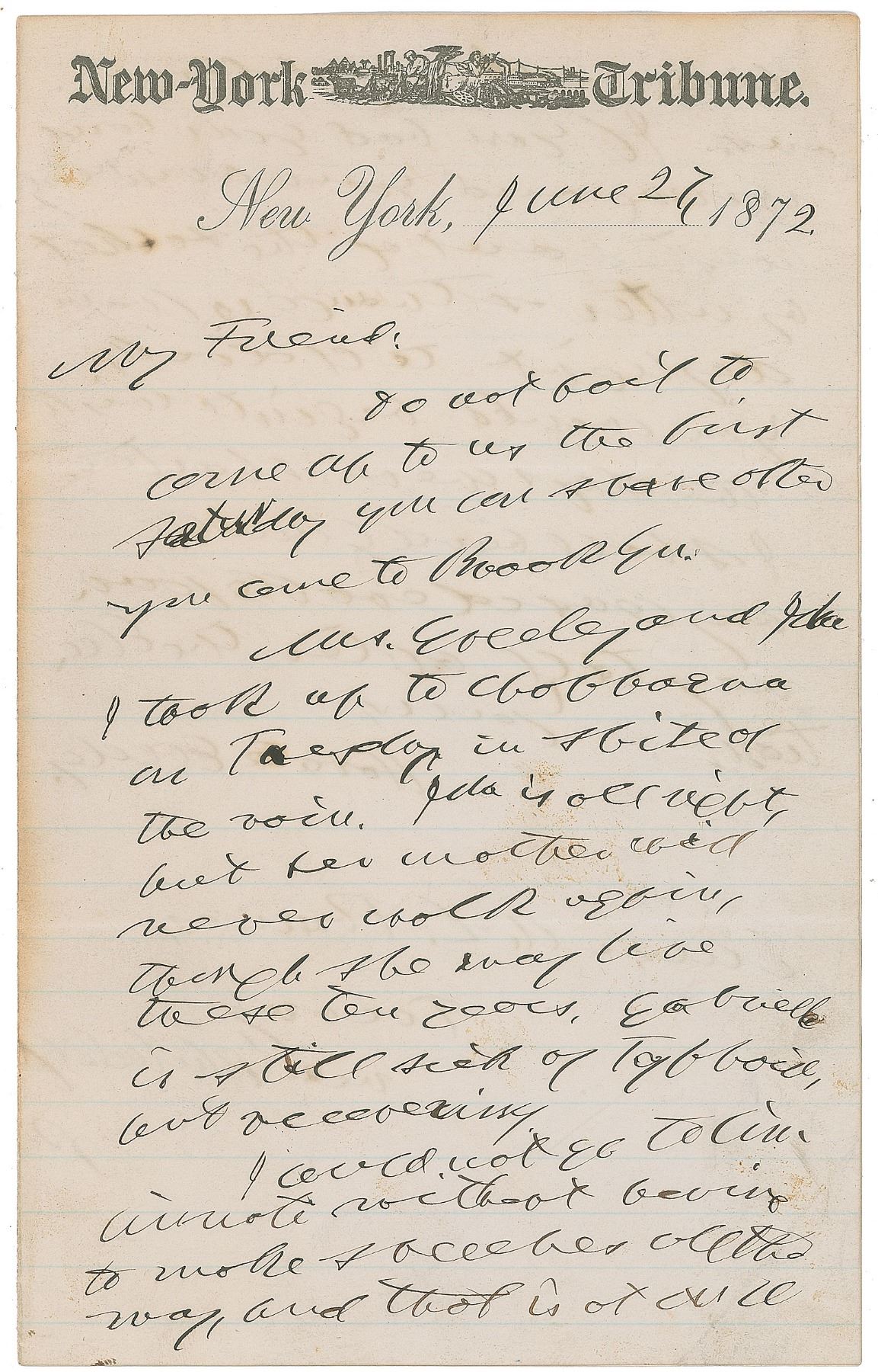 ALS, one page both sides, 5 x 8, New-York Tribune letterhead, June 27, 1872. Letter to a friend in Pennsylvania, inviting her to come to Brooklyn and providing updates on the health of his family. In fine condition, with some light soiling.