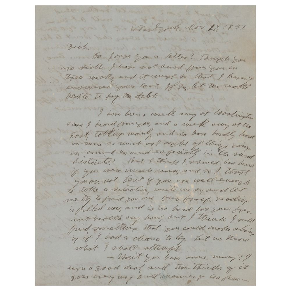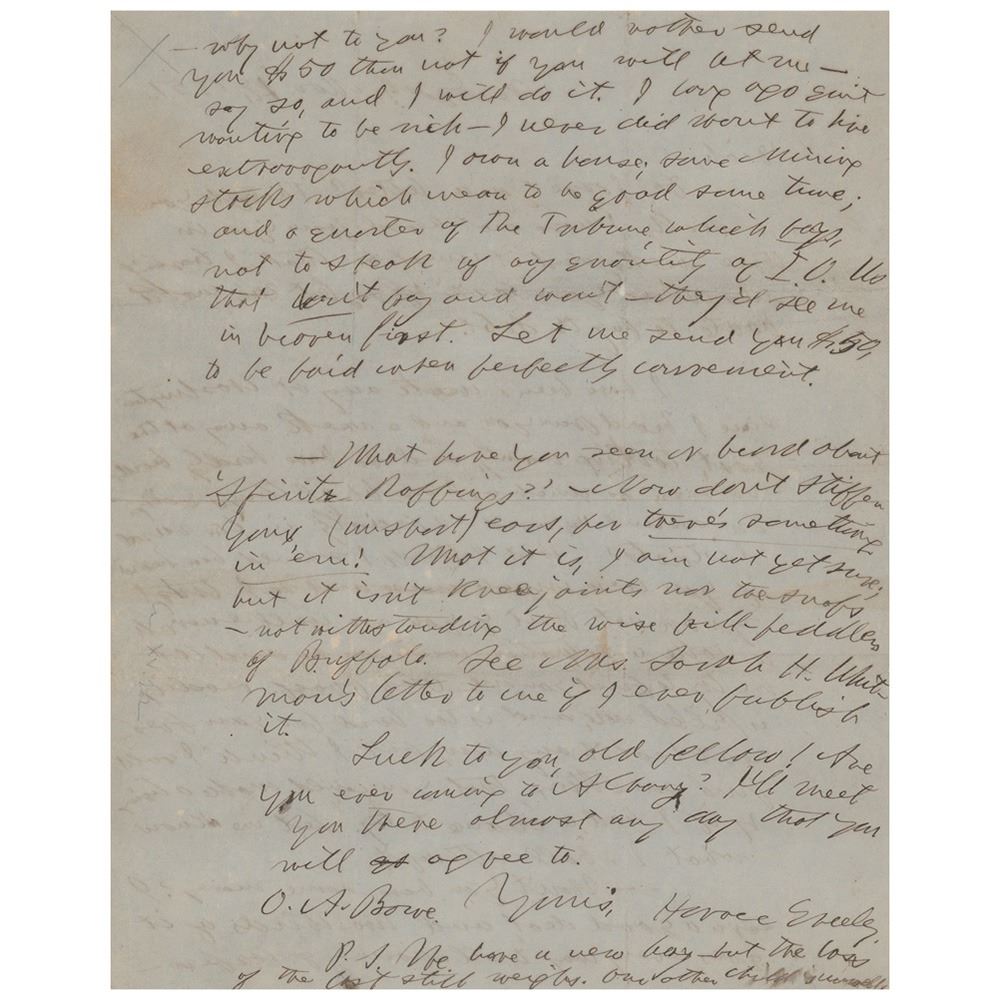 ALS, one page both sides, 7.75 x 9.75, November 19, 1851. Charitable handwritten letter to Obidiah A. Bowe, with whom he learned the printers' trade. In part: "If you are well enough to take a situation, write me so, and let me try to find you one. Our proofreading is filled now, and is too hard for your present health any how, but I think I could find something that you could make a living by if I had a chance to try. Let me know what I shall attempt. Won't you have some money? I earn a good deal and two-thirds of it goes every way…why not to you? I would rather send you $50 than not if you will let me—say so, and I will do it. I long ago quit wanting to be rich—I never did want to live extravagantly. I own a house; some mining stocks which mean to be good some time; and a quarter of the Tribune…What have you seen or heard about 'spirit rappings'? Now don't stiffen your (unshort) ears, for there's something in 'em! What it is, I am not yet sure, but it isn't knee joints nor toe snaps—notwithstanding the wise pill-peddlers of Buffalo." In fine condition, with scattered small stains, and professional overall silking.
