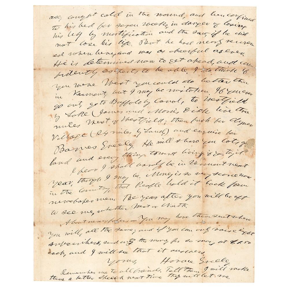 ALS, three pages on two adjoining sheets, 8 x 10, December 27, 1842. Addressed from the "Tribune Office," a handwritten letter to Nathaniel Fish, a Justice of the Peace from Westhaven, Vermont, in part: "I came back from a short visit to New Hampshire on Sunday morning…I am very confident that we have seen the worst, and that things will soon take a…turn in the country, as they have already done here. In the cities we have touched bottom, and are now coming up…But there is no mistake that things are tending to good. We are shipping large amounts of produce abroad and buying little in return; and, though prices are low on our side, they are equally low on the others. This must be our consolation under the low prices, which are certain to continue until we have seen improvement in the currency. While the banks remain so restricted as now, and we have no paper that will pass much further than you could throw it in a good breeze, all prices must be low." In very good to fine condition, with scattered light foxing and staining. Accompanied by a full letter of authenticity from JSA.