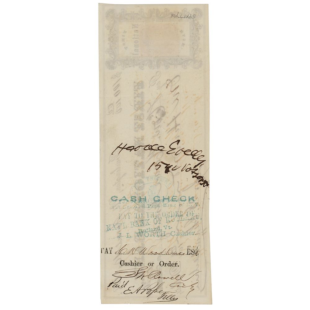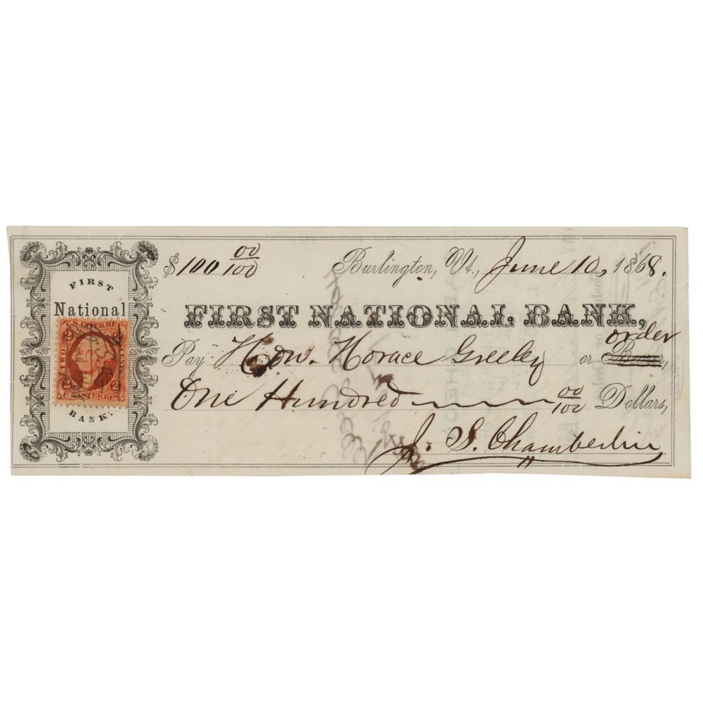 First National Bank check, 7.5 x 2.75, filled out in another hand and made payable to Hon. Horace Greeley for $100, June 10, 1868. Endorsed boldly on the reverse by Greeley. In fine condition.