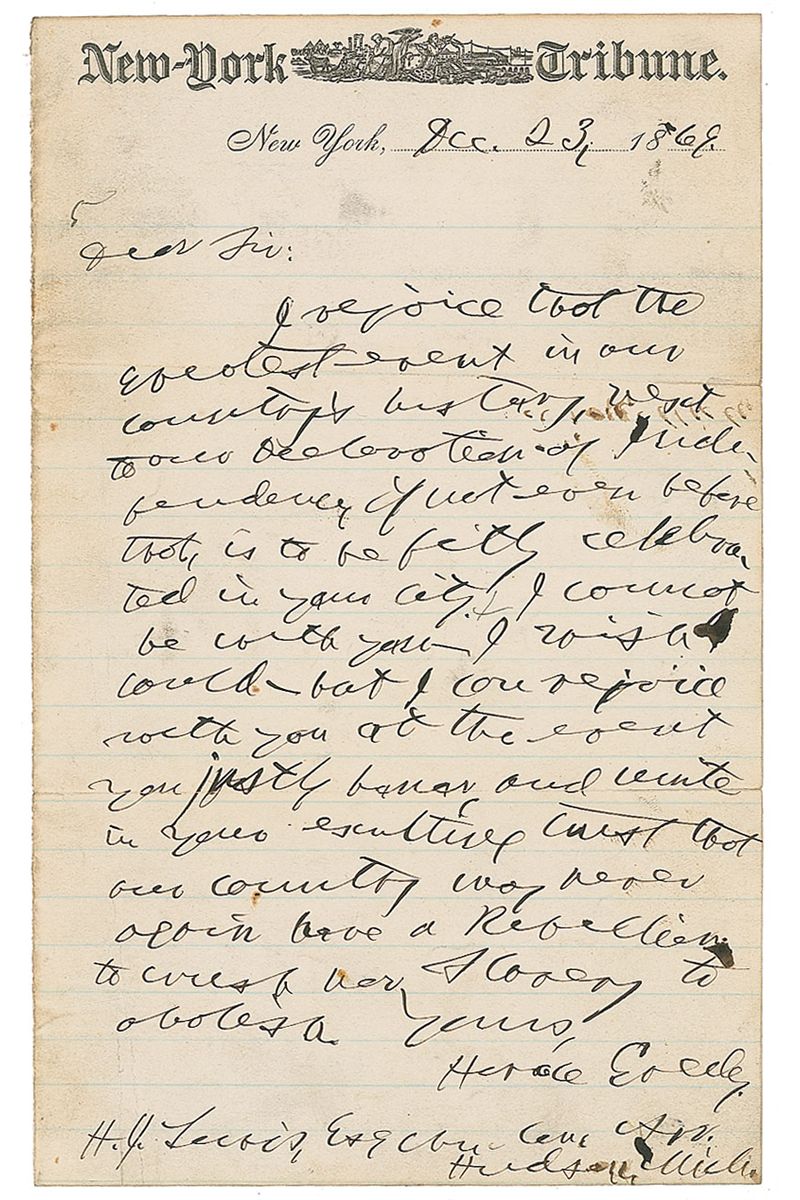 ALS, one page, lightly-lined, 5 x 8, New York Tribune letterhead, December 23, 1869. Letter to H. Y. Lewis in Greeley’s difficult to decipher hand declining an invitation to what he calls “the greatest event in our country’s history.” In very good condition, with scattered toning and soiling, partial separations along horizontal folds, and a few creases.
