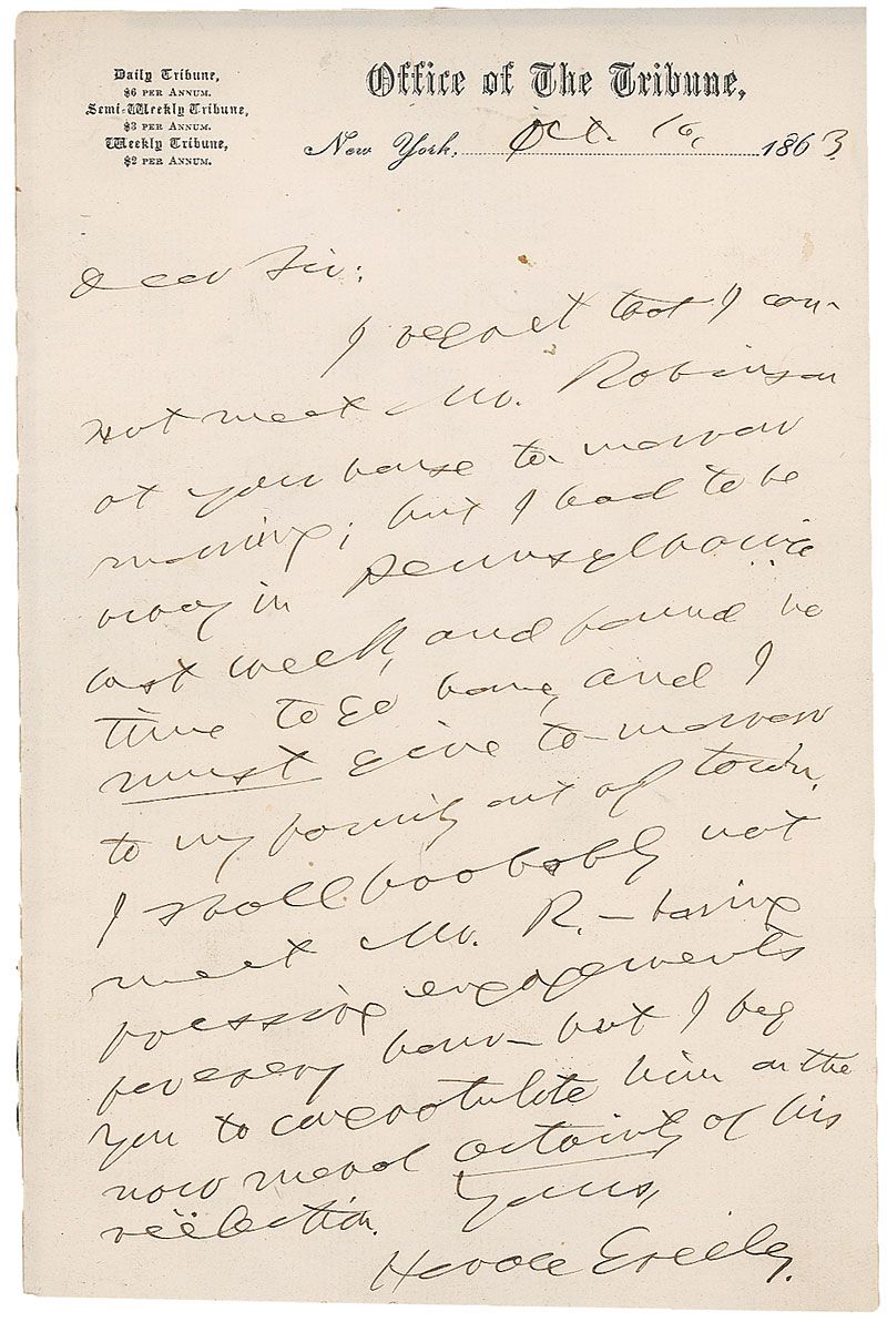 Founder and editor of the New York Tribune (1811–1872) who used the power of his newspaper to advocate for a variety of liberal causes, most importantly the call for emancipation of slaves during the Civil War. Civil War-dated ALS, one page, 5 x 7.75, Office of the Tribune letterhead, October 16, 1863. Letter to a gentleman. In full: “I regret that I cannot meet Mr. Robinson at your house tomorrow morning; but I had to be away in Pennsylvania last week, and found no time to go home, and I must give tomorrow to my family out of town. I shall probably not meet Mr. R.—having pressing engagements for every hour—but I beg you to congratulate him on the now moral certainty of his reelection.” In fine condition, with a couple light spots of soiling and a slightly rough left edge from removal of the second integral page. Accompanied by an unsigned engraving of Greeley. Greeley became increasingly at odds with President Lincoln as the Civil War drew on, and his reluctance to support him in the 1864 elections cost the paper some popular support and its influence began to wane. A great example from the peak of Greeley’s politically active life from behind the editor’s desk at the New York Tribune.
