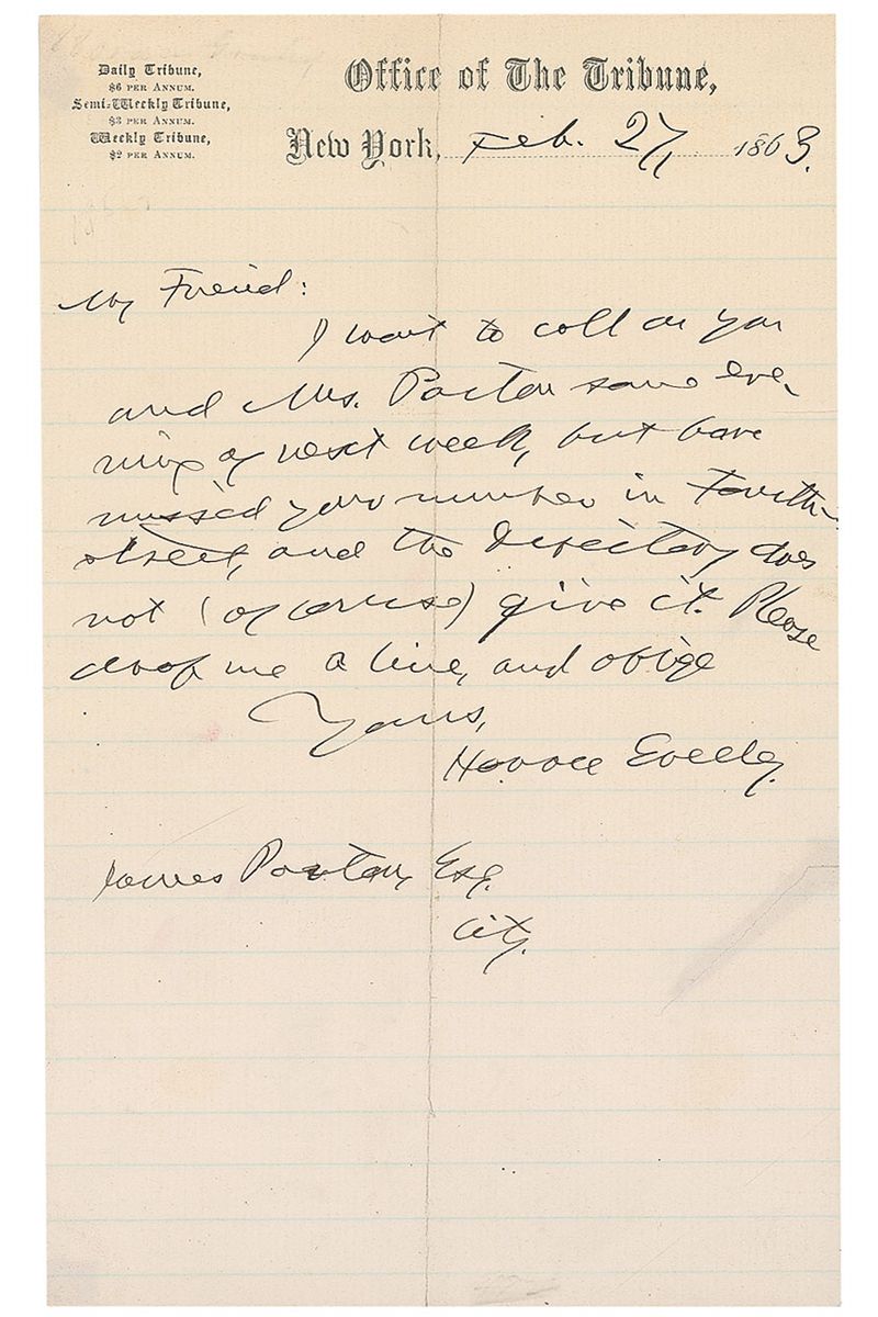 ALS, one page, lightly-lined, 5 x 8, Office of the Tribune letterhead, February 27, 1863. Letter to James Porter. In full: “I want to call on you and Mrs. Porter some evening of next week, but have missed your number in Fourth Street, and the directory does not (of course) give it. Please drop me a line, and oblige.” In fine condition, with intersecting folds, and a crease to lower right.