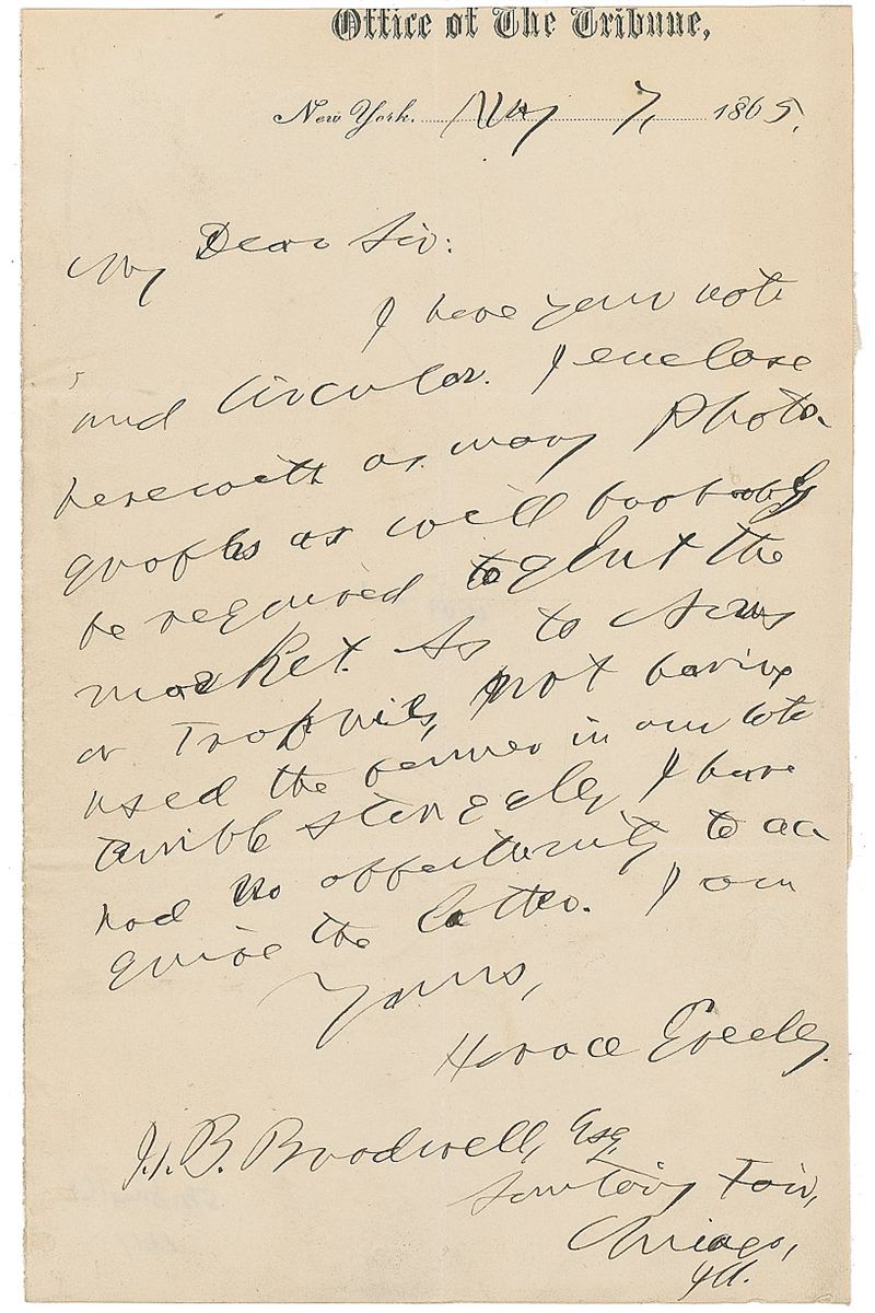 Founder and editor of the New York Tribune (1811–1872) who used the power of his newspaper to advocate for a variety of liberal causes, most importantly the call for emancipation of slaves during the Civil War. ALS, one page, 5 x 7.75, Office of the Tribune letterhead, New York, May 7, 1865. Letter to J. I. B. Broadwell of the Chicago Sanitary Fair. In part: “I enclose herewith as many photographs as will probably be required to glut the market. As to arms or trophies, not having used the former in our late terrible struggles I have had no opportunity to acquire the latter.” In fine condition, with slightly trimmed edges.