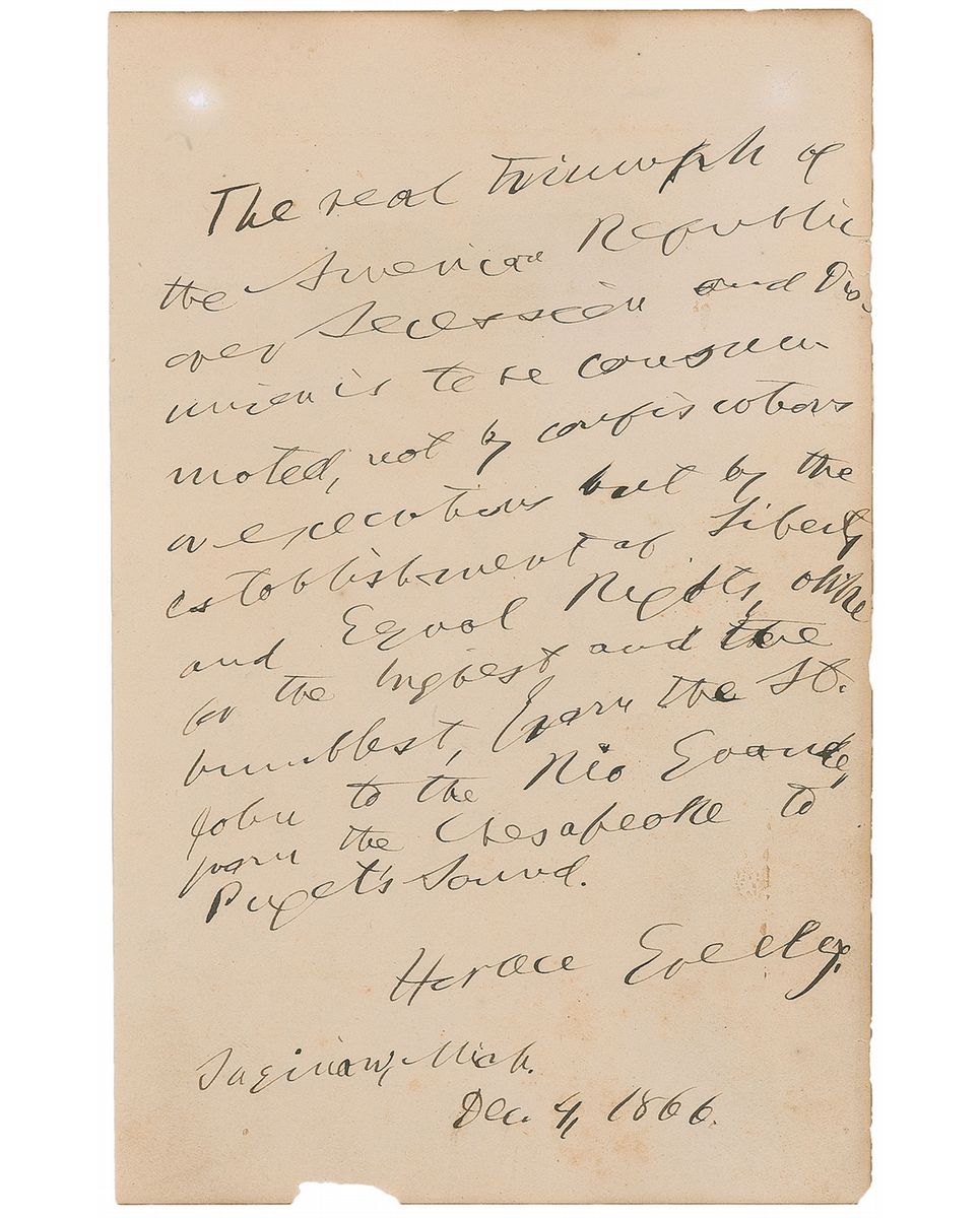 AQS on an off-white 4.75 x 7.5 sheet, signed at the conclusion in black ink, “Horace Greeley, Saginaw, Mich., Dec. 4, 1866.” Greeley pens an idealistic abolitionist and patriotic quote. In full: “The real triumph of the American Republic over Secession and Disunion is to be consecrated, not by confiscation or execution but by the establishment of Liberty and Equal Rights, for the highest and the humblest, from the St. John to the Rio Grande, from the Chesapeake to Puget’s Sound.” Light scattered staining, a chip to the bottom edges, and two small holes to upper corners, otherwise fine condition. Accompanied by an unsigned photo.