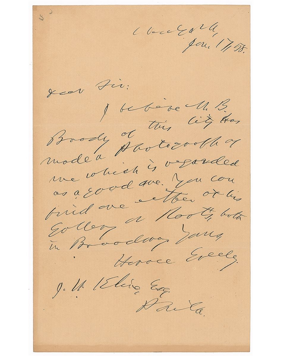 ALS, one page, 5 x 8, January 17, 1858. Letter to a gentleman looking for a photo of Greeley, in full, “I believe M. B. Brady of this city has made a photograph of me which is regarded as a good one. You could find one either at his gallery or Root’s, both in Broadway.” In fine condition, with a uniform shade of mild toning.