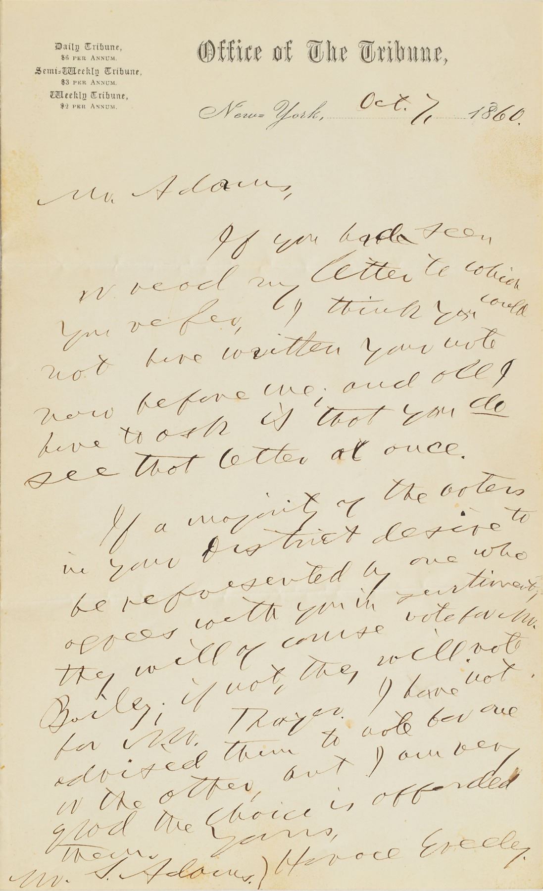 Founder and editor of the New York Tribune (1811-1872) who used the power of his newspaper to advocate for a variety of liberal causes, most importantly the call for emancipation of slaves during the Civil War. ALS, one page, 5 x 8, Office of the Tribune letterhead, October 7, 1860. Letter to Silas Adams, in full: "If you have seen or rec'd my letter to which you refer, I think you could not have written your note now before me; and all I have to ask is that you do see that letter at once. If a majority of the voters in your District desire to be represented by one who agrees with you in sentiment, they will of course vote for Mr. Bailey; if not, they will vote for Mr. Thayer. I have not advised them to vote for one or the other, and I am very glad the choice is offered them." In fine condition. Accompanied by the original mailing envelope, addressed in Greeley's own hand.