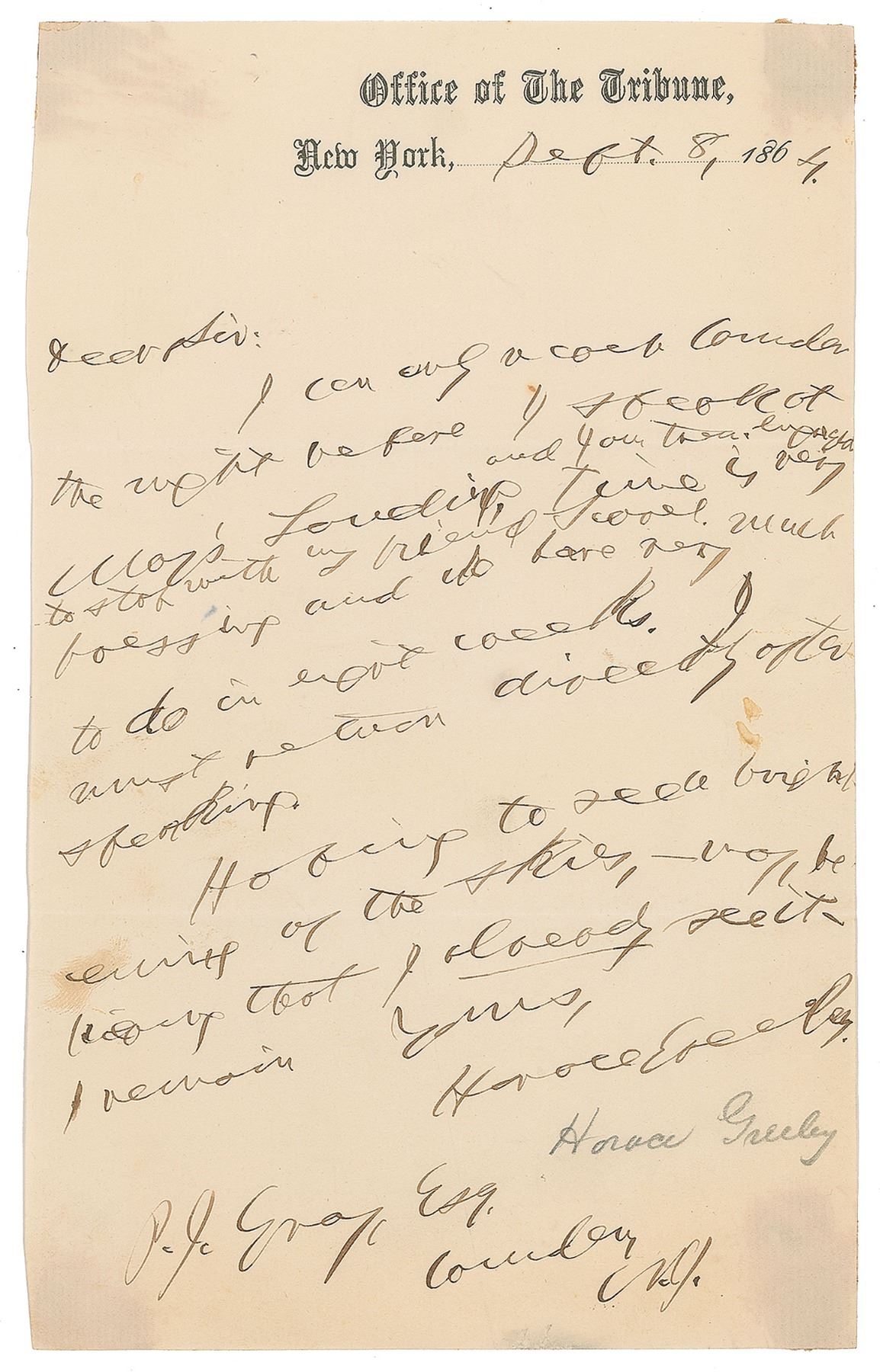 ALS, one page, 5 x 8.25, Office of The Tribune letterhead, September 8, 1864. Letter to P. J. Gray, setting up a meeting, in his extremely difficult to read hand. In very good condition, with trimmed edges, and show-through at the corners from old mounting remnants on the back.