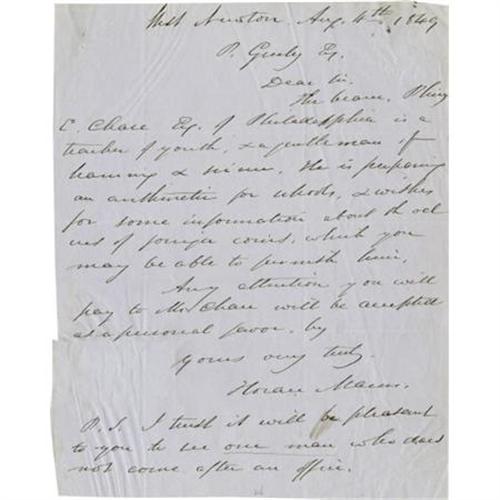 <B>Horace Mann Autograph Letter Signed.</B></I> One page, 6.75” x 8.5”, August 4, 1849. Horace Mann (1796-1859) was a well-known educator, abolitionist, member of the U.S. House of Representatives, and brother-in-law of legendary author Nathaniel Hawthorne (1804-1864), best known for the novel <I>The Scarlet Letter.</B></I> In this letter to P. Greeley of West Newton, Massachusetts, Mann writes in full: <I>“Dear Sir, The bearer, Pliny E. Chase Esq. of Philadelphia is a teacher of youth, and a gentleman of learning and science. He is preparing an arithmetic for schools, and wishes for some information about the values of coins, which you may be able to furnish him. Any attention you will pay to Mr. Chase will be accepted as a personal favor by yours very truly, Horace Mann. P. S. I trust it will be pleasant to you to see one man who does not come after an office.” </B></I>The letter is in good condition with four horizontal folds and several light creases. <I>From the collection of Henry E. Luhrs.</B></I><BR><BR><b>Shipping:</b> Flat Material, Small (<a target="_blank" href="http://www.heritageauctions.com/common/shipping.php">view shipping information</a>)