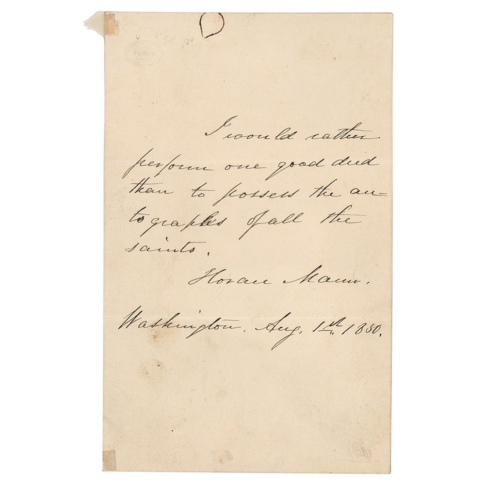 American politician, abolitionist, and education reformer (1796–1859) remembered for his promotion of public education. AQS signed "Horace Mann," one page, 4 x 6.75, August 1, 1850. In full: "I would rather perform one good deed than to possess the autographs of all the saints." In fine condition, with a rusty circular paperclip impression to the top.