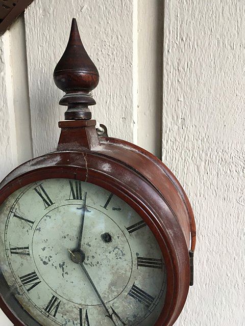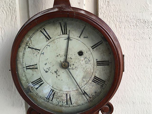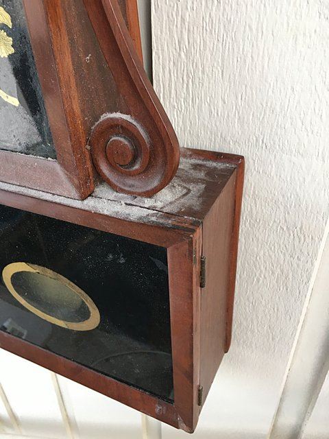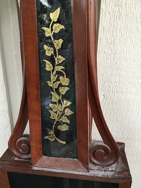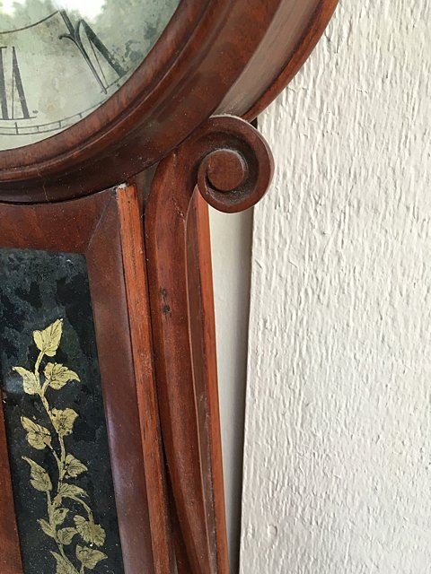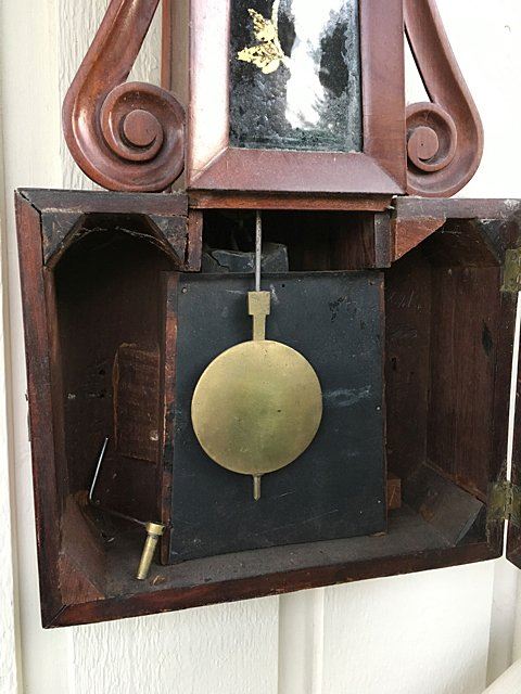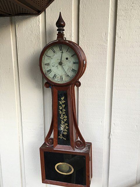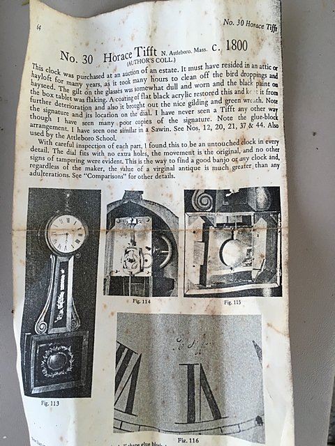 Horace Tifft, N. Attleboro, MA, Banjo Clock, c. 1800, hand painted dial, reverse painted tablets with black and gold leaf, wooden finial, pendulumn, very nice Horace Tifft Banjo Clock found with original auction listing papers. Measures approx. 33" tall x 10" wide x 3" deep.