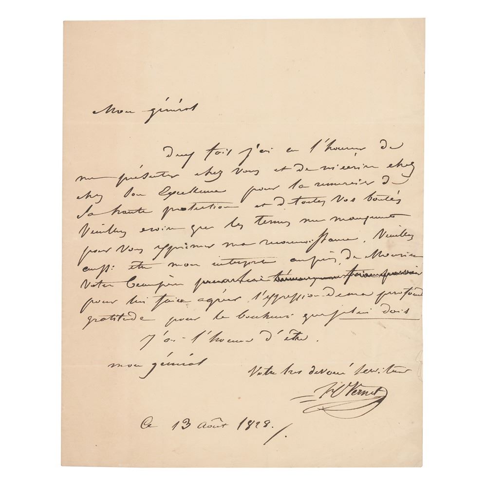 ALS in French, signed “H. Vernet,†one page, 7.25 x 9, August 13, 1828. Untranslated handwritten letter by Horace Vernet. In very good to fine condition, with light creasing along the right edge.