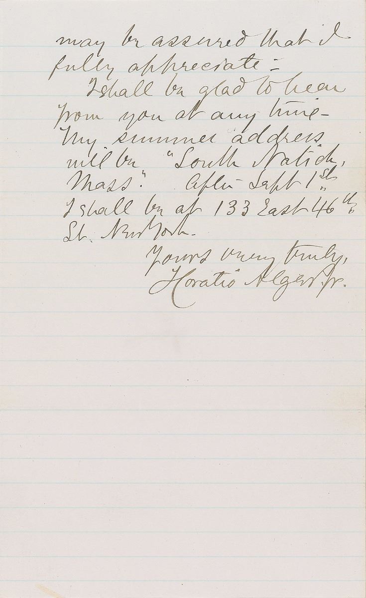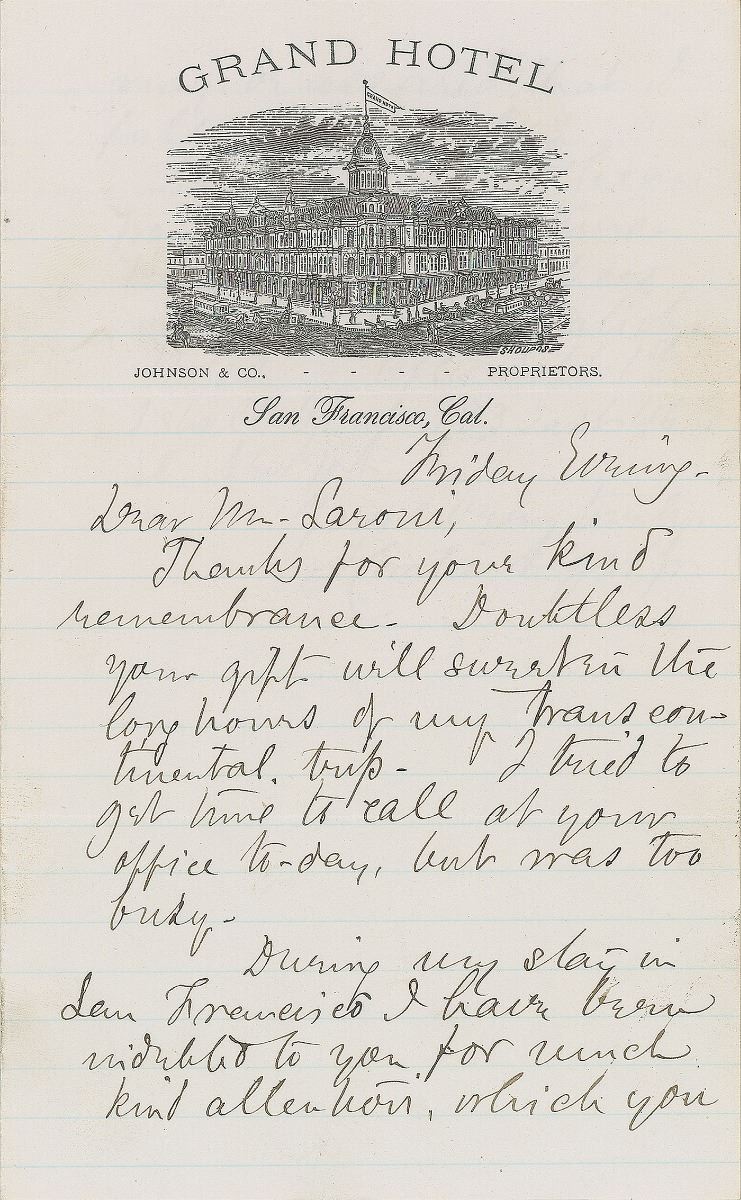 Massachusetts author (1832–1899) best remembered for young adult novels characterized by ‘rags-to-riches’ narratives, such as the Ragged Dick, Luck and Pluck, and Tattered Tom series. ALS, two pages, lightly-lined on two adjoining sheets, 5 x 8, Grand Hotel, San Francisco, California letterhead, no date. Letter to Mr. Saroni, in full: “Thanks for your kind remembrance. Doubtless your gift will sweeten the long hours of my transcontinental trip. I tried to get time to call at your office to–day, but was too busy. During my stay in San Francisco I have been indebted to you for much kind attention, which you may be assured that I fully appreciate. I shall be glad to hear from you at any time. My summer address will be ‘South Natick, Mass.’ After Sept 1st, I shall be at 133 East 46th St. New York.” In fine condition.