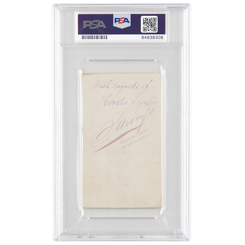 Uncommon 2.5 x 4 carte-de-visite photo of the popular writer by Sarony, signed on the reverse in purple ink, "With regards of Horatio Alger, Jr." In fine condition. Encapsulated in a PSA/DNA authentication holder.