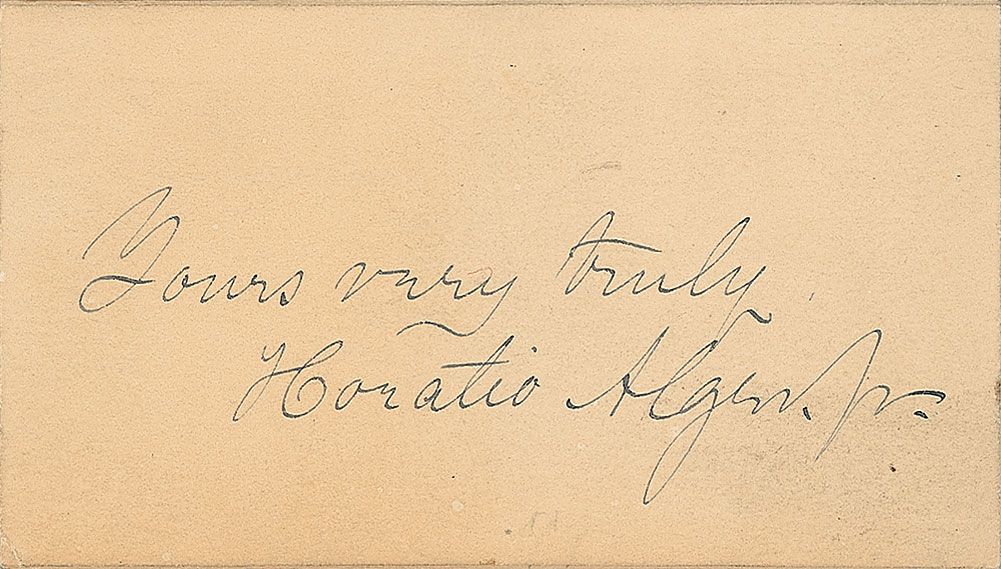 American author (1832–1899) best known for his popular Victorian ‘rags to riches’ dime novels. Ink signature, “Yours very truly, Horatio Alger, Jr.,” on an off-white 3 x 1.75 card. In fine condition, with some mild soiling and mounting remnants to reverse