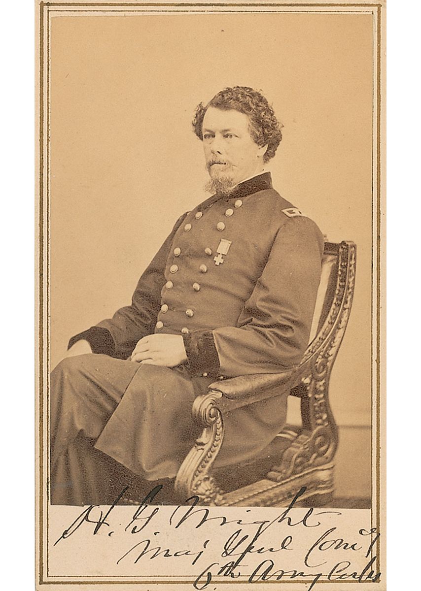 Original 2.25 x 4 carte-de-visite photo by Gardner of Washington, D. C., signed in the lower border in black ink, “H. G. Wright, Maj Genl Comg, 6th Army Corps.” In fine condition, with a revenue stamp affixed to reverse.