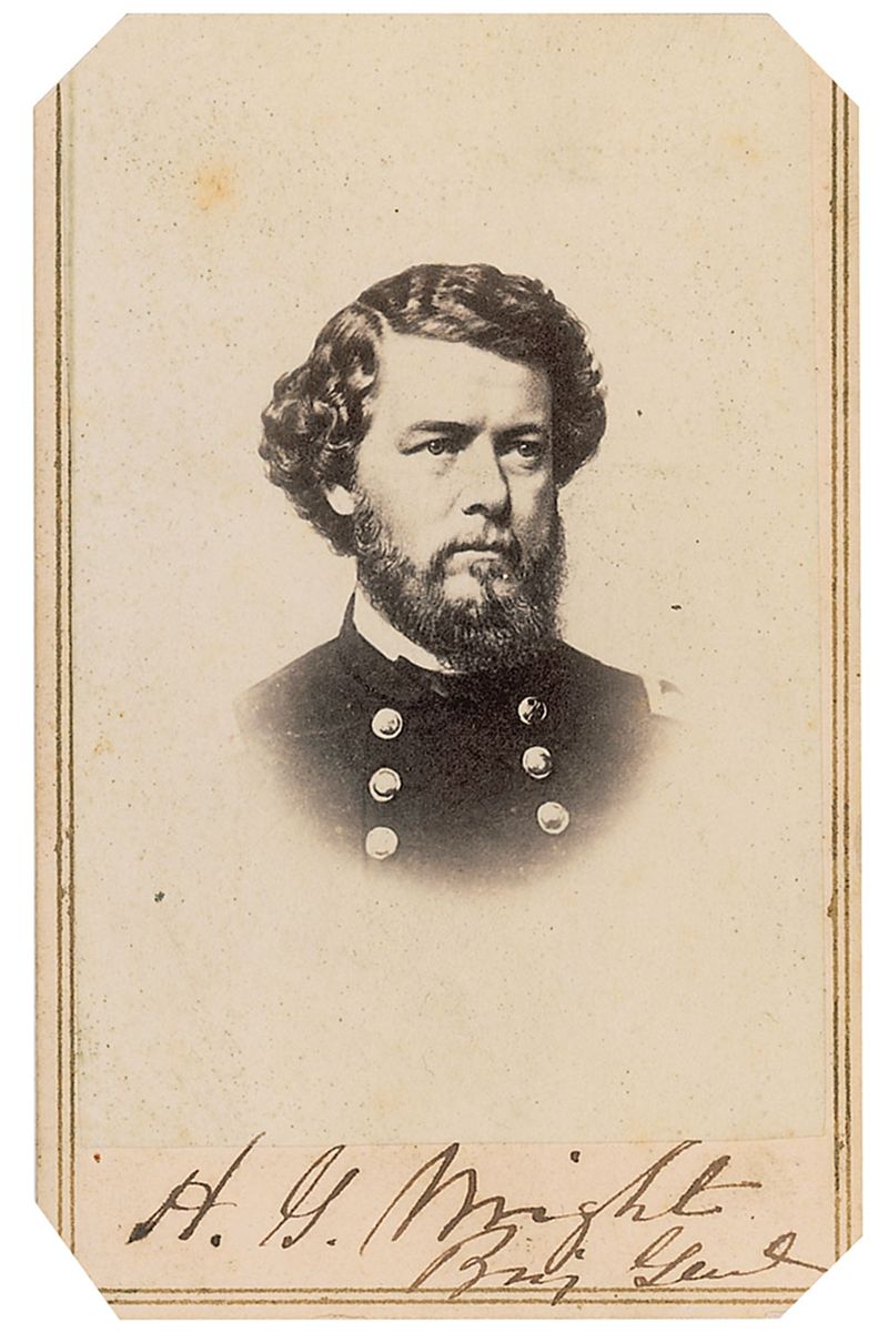Union general and engineer (1820–1899) who helped build the Brooklyn Bridge and complete the Washington Monument. Original 2.25 x 4 carte-de-visite photo by E. & H. T. Anthony, signed in the lower border in black ink, “H. G. Wright, Brig. Genl.” Clipped corner tips, otherwise fine condition.