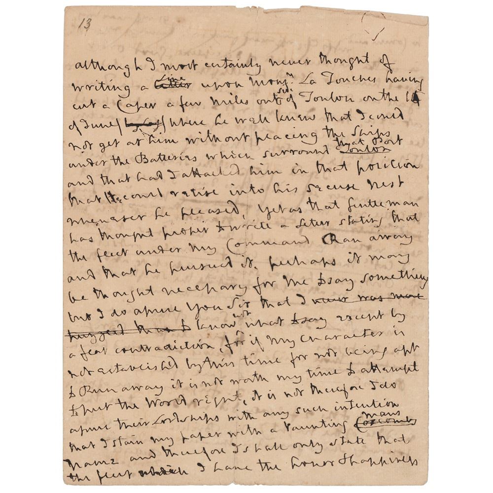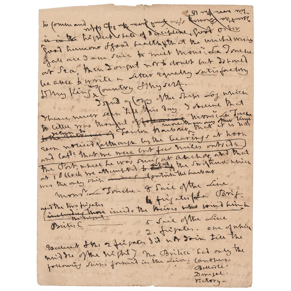 Autograph draft of an important letter by Horatio Nelson, one page both sides, 7.25 x 9.5, [August 12, 1804]. Nelson's unsigned handwritten draft of a fascinating letter to First Secretary of the Admiralty William Marsden, defending himself against accusations that he 'ran away' from Vice Admiral Louis-Rene de Latouche-Tréville off Toulon in June 1804. In part: "Although I most certainly never thought of writing a line upon Mons'r La Touche's having cut a caper a few miles out of Toulon on the 14th of June where he well knew that I could not get at him without placing the ships under the Batteries which surround that port and that had I attacked him in that position that he could retire into his secure nest whenever he pleased, yet as that gentleman has thought proper to write a letter stating that the fleet under my command ran away and that he pursued it, perhaps it may be thought necessary for me to say something but I do assure you Sir that I know not what to say…If my character is not established by this time for not being apt to run away it is not worth my time to attempt to put the world right, it is not therefore I do assure their Lordships with any such intention that I stain my paper with a taunting man's name and therefore I shall only state that the fleet which I have the honor & happiness to command in…good humour & good health & that the united wishes of all are I am sure to meet Mons'r La Touche at sea, then I ought not to doubt but I should be able to write a letter equally satisfactory to my King, my country & myself.