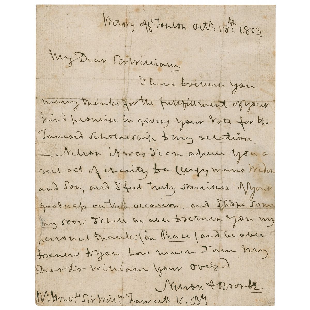 Highly esteemed British admiral (1758–1805) best known for his participation in the Napoleonic Wars, during which, in the Battle of Trafalgar, he lost his life. ALS signed “Nelson & Bronte,” one page, 7.25 x 9, October 18, 1803. While aboard the Victory, Nelson writes a letter of thanks to Sir William Fawcett. In full: “I have to return you many thanks for the fulfillment of your kind promise in giving your vote for the…Scholarship to my relation. Nelson it was I can assure you a real act of charity to a clergy man’s Widow and son, and I feel truly sensible of your goodness on the occasion and I hope someday soon I shall be able to return you my personal thanks (in peace) and be able to show to you how much I am Desr Sir William your obd svt.” Letter is affixed to an identical size sheet. Repairs to complete separations along intersecting folds, one vertical fold touching a single letter of signature, and scattered toning and soiling, otherwise very good condition.
