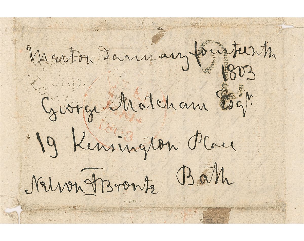 Highly esteemed British admiral (1758–1805) best known for his participation in the Napoleonic Wars, during which, in the Battle of Trafalgar, he lost his life. Full hand-addressed free frank, measuring 9 x 7.25 unfolded, with panel measuring 4.75 x 3.25, addressed by Nelson, “Merton, January fourteenth, 1803, George Matcham, Esq’r, 19 Kensington Place, Bath,” and franked in the lower left, “Nelson & Bronte.” The frank appears on the reverse of the final page of an interesting four- to seven-page letter written by Francis Oliver to Nelson’s brother-in-law George Matcham, discussing the relative merits of Vienna and Dresden, stating that both cities are “exceedingly pleasant cheap and healthy” but with preference for the first (“Vienna is far preferable to settle at”). Other topics include: “the shortest cheapest way to Vienna” and the city’s suburbs, and the dismissal of the idea of living in Dresden, claiming to give Nelson’s opinion—“His Lordship will tell you the same that you would soon be tired of Dresden”; opinions on the weather, houses, theaters, servants, servant’s wages, crime (“high-way footpad rob[b]eries, or house breaking are seldom heard of”), water, bathing, taxes (“are very easy on housekeepers not 1/10th of what tis here”), education, summer evening entertainment, butcher’s meat, fish (“Even Sir Wm [Hamilton] is of the number of its admirers”), fruit, bread and table wine. He ends his arguments by stating, “My Lord, My Lady H. and Mr Cadogan have the same partiality for Vienna as I have myself. I can refer you to them & many others with safety,” and concludes his letter by describing his position with Nelson: “Of myself I have only to say, that the greatest happiness of my life is to be well with my great & good Patron Ld N. My supreme delight is to serve him & his,” noting that Matcham is “welcome to two months of my time, for the journey & to see you settled,” and offering the additional “service of his wife.” In very good condition, with a tear to the top panel (extending through the date), some stray ink to the upper right, and two small areas of paper loss where the seal was removed; Nelson’s signature is quite bold and impressive.