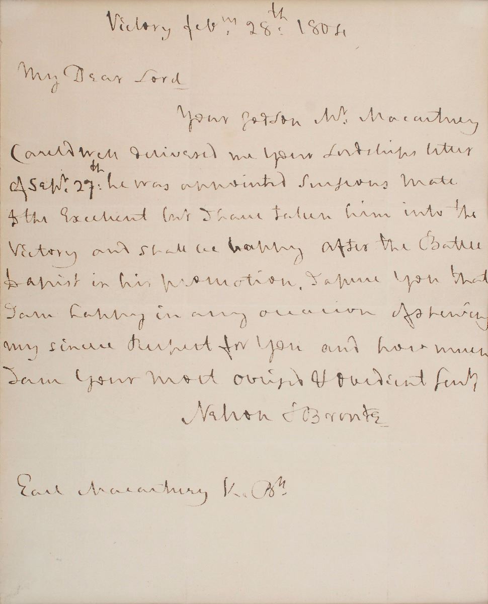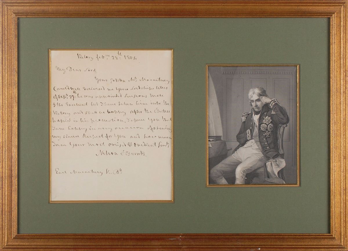 ALS signed “Nelson & Bronte,” one page, 7.25 x 9, February 28, 1804. Letter to Earl Macartney, written from the “Victory” while blockading Toulon. In part: “Your godson Mr. Macartney Cauldwell…was appointed surgeons mate to the Excellent but I have taken him into the Victory and shall be happy after the Battle to assist in his promotion.” Nicely double-matted and framed with an engraved portrait to an overall size of 21 x 15. In fine condition, with intersecting folds. The surgeon in question, Dr. George Macartney Caldwell, RN, was lost at sea on the HMS Arab in 1824.