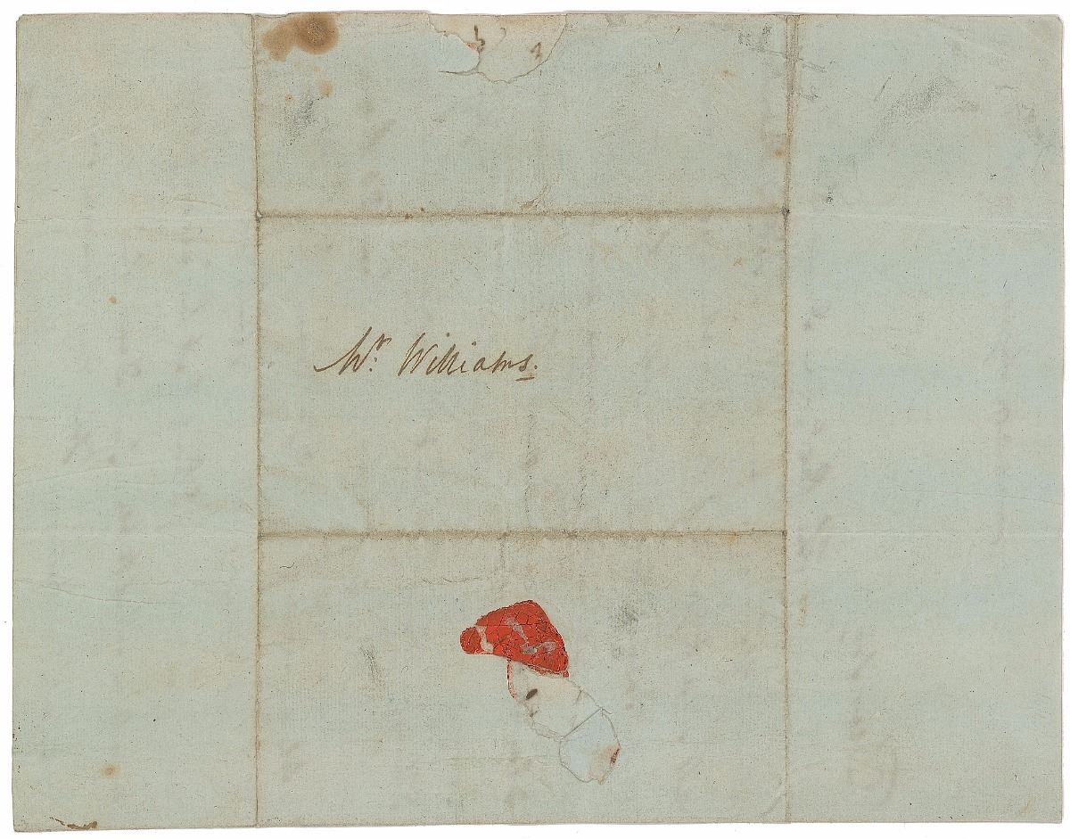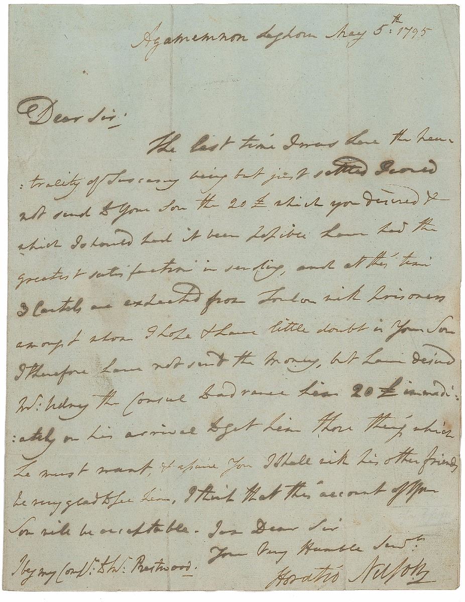 Lieutenant Charles David Williams served under Nelson aboard the Agamemnon and had, at the orders of the English consul acting without Nelson’s supervision, been navigating a vessel towards Toulon when he was captured by the French. They at first feared him lost, but Nelson happily informed Daniel Williams in a letter of February 27 that his son had only been taken prisoner and promised to try to send him some money. While this did not prove possible—among Nelson’s distractions in the ensuing period was the Battle of Genoa—he is optimistic about Lieutenant Williams’s return with his fellow shipmates. A superb example of one of Nelson’s early letters with military content, written prior to the amputation of his arm in 1797.