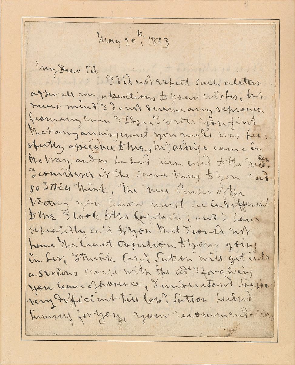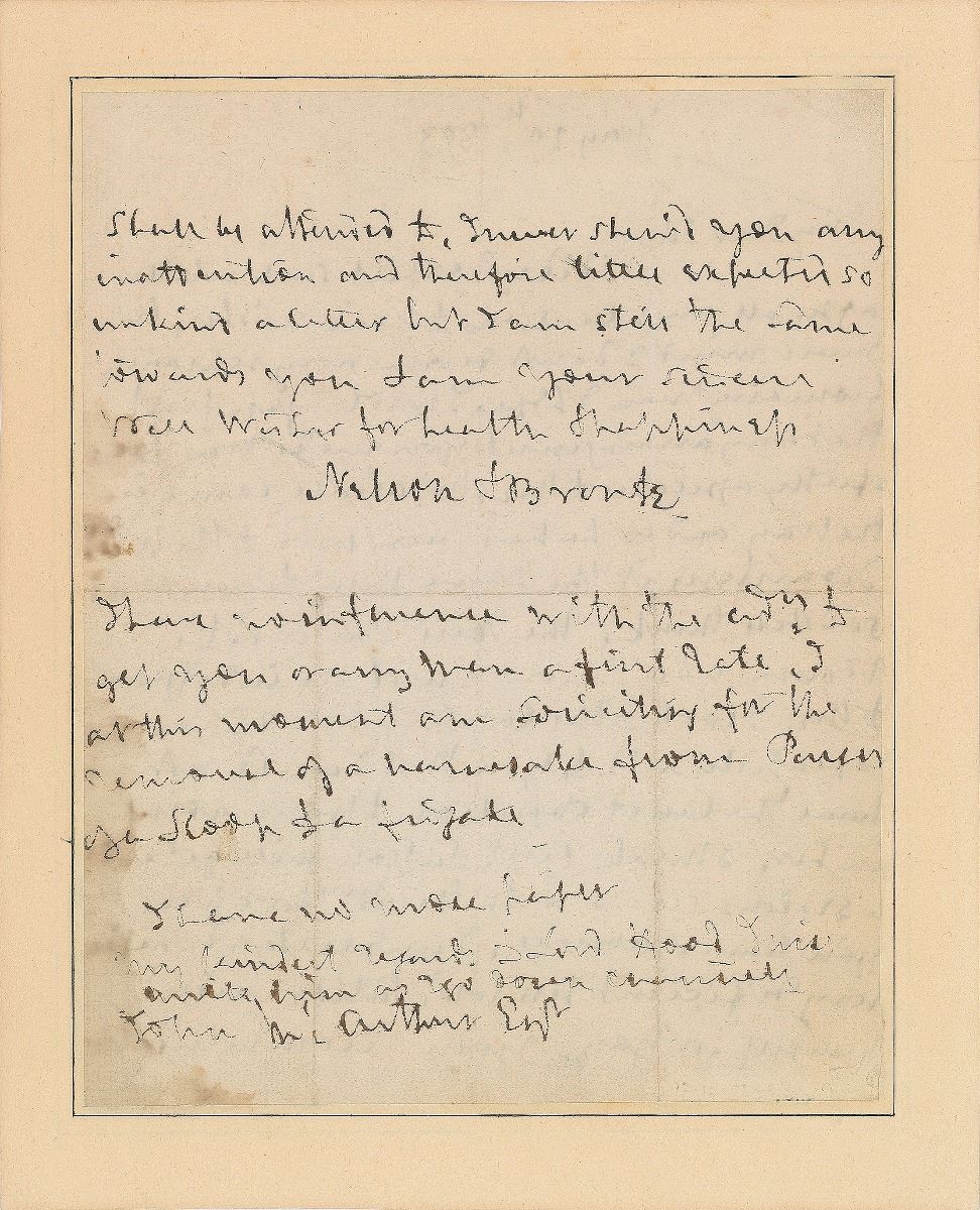 ALS signed “Nelson & Bronte,” one page both sides, 7 x 8.75, May 20, 1803. Letter to John McArthur, in part: “I did not expect such a letter after all my attentions to your wishes, but never mind. I do not deserve any reproach from any man I hope. I wrote you first that any arrangement you made was perfectly agreeable to me. Mr. Aldrige came in the way and as he had been used to the Vict’y, I considered it the same thing to you, and so I still think. The new Purser of the Victory you know must be indifferent to me. I look to the captaining and I have repeatedly said to you that I could not have the least objection to your going in here. I think Capt. [Samuel] Sutton will get into a serious scrape with the Admiralty for giving you leave of absence. I understand she is very deficient till Capt. Sutton judged himself for you, your recommendation shall be attended to. I never showed you any inattention and therefore little expected so unkind a letter, but I am still the same towards you.” Nelson adds a postscript, "I have influence with the Ad’y to get you or any man a first rate. I at this moment am soliciting for the removal of a namesake from Purser of a Sloop to a frigate. I have no more paper. My kindest regards to Lord Hood, I will write him as I go down channel." Professionally inlaid into a slightly larger sheet. In very good to fine condition, with light edge staining. Provenance: Anderson Galleries, New York, March 26, 1917.