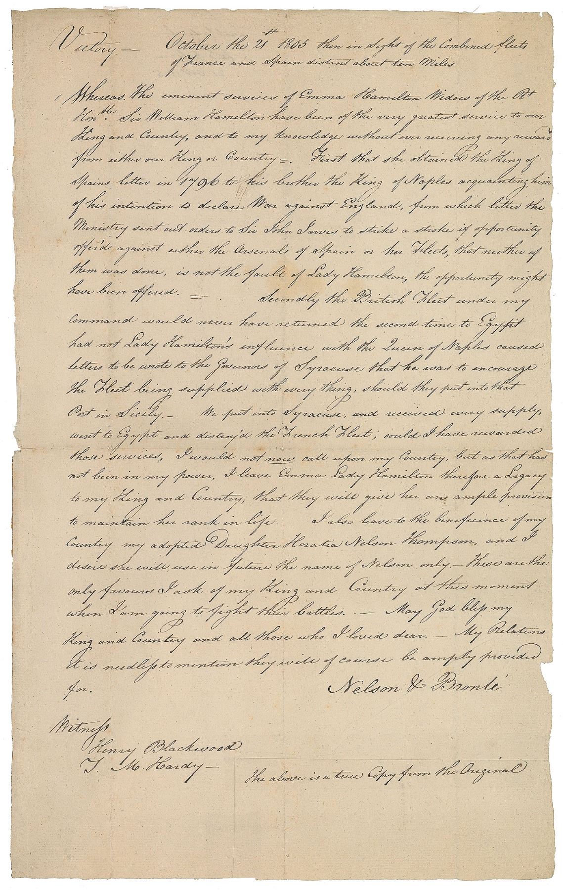 Contemporary manuscript copy of a Horatio Nelson's last written words, entered in his diary as the Battle of Trafalgar began, one page, 9.75 x 15.75, October 21, 1805. In part: "Victory—October the 21st 1805, then in Sight of the Combined fleets of France and Spain distant about ten Miles. Whereas The eminent services of Emma Hamilton…have been of the very greatest service to our country…First that she obtained the King of Spain's letter…of his intention to declare War against England…Secondly the British Fleet under my command would never have returned the second time to Egypt had not Lady Hamilton's influence…I leave Emma Lady Hamilton therefore a Legacy to my King and Country, that they will give her an ample provision to maintain her rank in life. I also leave to the beneficence of my Country my adopted Daughter Horatia Nelson Thompson, and I desire she will use in future the name of Nelson only.—These are the only favours I ask of my King and Country at this moment when I am going to fight their battles." At the conclusion, the clerk has added Nelson's signature, "Nelson & Bronte," as well as those of the witnesses, Henry Blackwood and Thomas Masterman Hardy, with "The above is a true Copy from the Original." In fine condition. After Lord Nelson's death, Captain Hardy was charged with conveying his diary back to England. Despite the efforts of Captain Hardy and other friends, Parliament did not bestow any honors or pension upon Lady Hamilton or their child, Horatia—despite Nelson's final and most earnest request.
