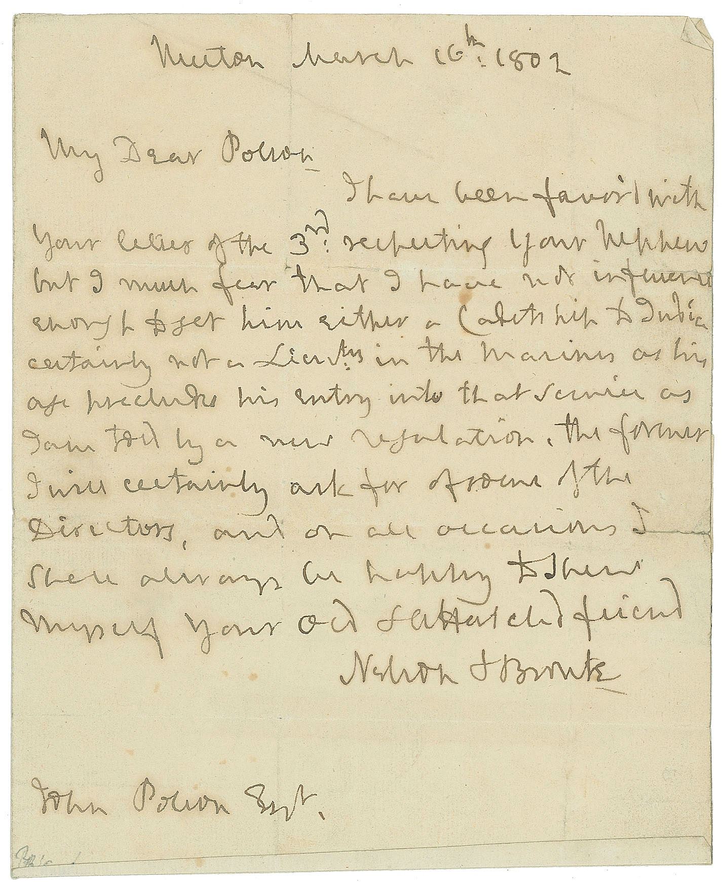 ALS signed “Nelson & Bronte,” one page, 7.5 x 9, March 16, 1802. Written from Merton, a letter to John Polion, in full: "I have been favor'd with your letter of the 3rd respecting your nephew but I much fear that I have not influence enough to get him either a Cadetship to India certainly not a Lieut'y in the Marines as his age precludes his entry into that service as I am told by a new regulation. The former I will certainly ask for of some of the Directors, and on all occasions I shall always be happy to think myself your old & attached friend." Reverse of second integral page addressed by Nelson, who adds his signature below, "Nelson & Bronte." In very good condition, with creasing, and old repairs to fold splits and seal-related paper loss.