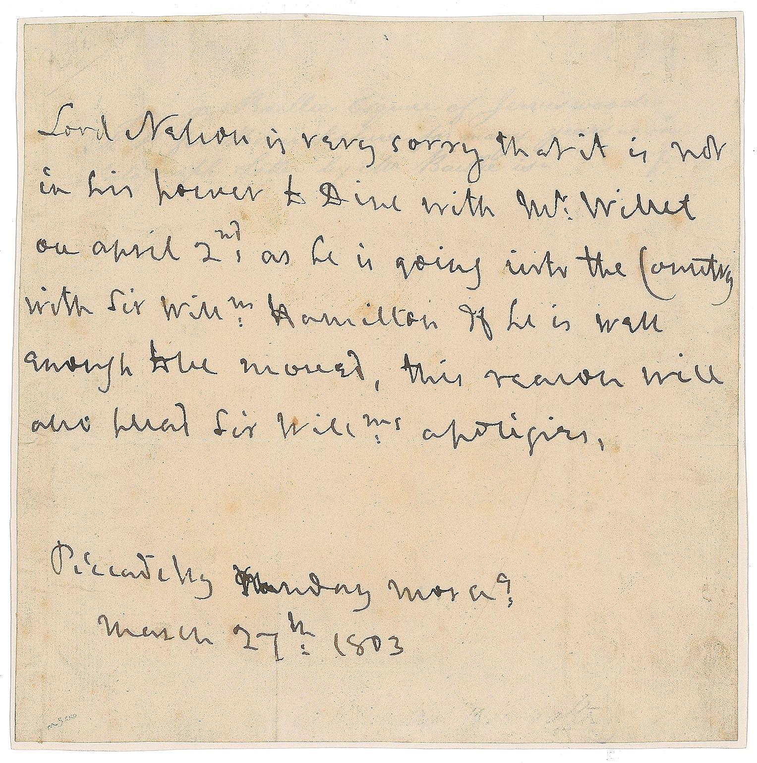 Third-person ALS, signed within the text, “Lord Nelson,” one page, 7.25 x 7.25, March 27, 1803. Letter regretfully declining a dinner invitation on behalf of himself and Sir William Hamilton, the husband of Nelson's mistress Emma Hamilton. In full: "Lord Nelson is very sorry that it is not in his power to dine with Mr. Willet on April 2nd as he is going into the country with Sir Will'm Hamilton if he is well enough to be moved, this reason will also plead Sir Will'ms apologies." Affixed to a slightly larger card and in fine condition, with trimmed edges and light soiling. William Hamilton was certainly not "well enough to be moved"—he died ten days later at his house in Piccadilly. A boldly penned, desirable letter connecting Nelson to the Hamiltons.