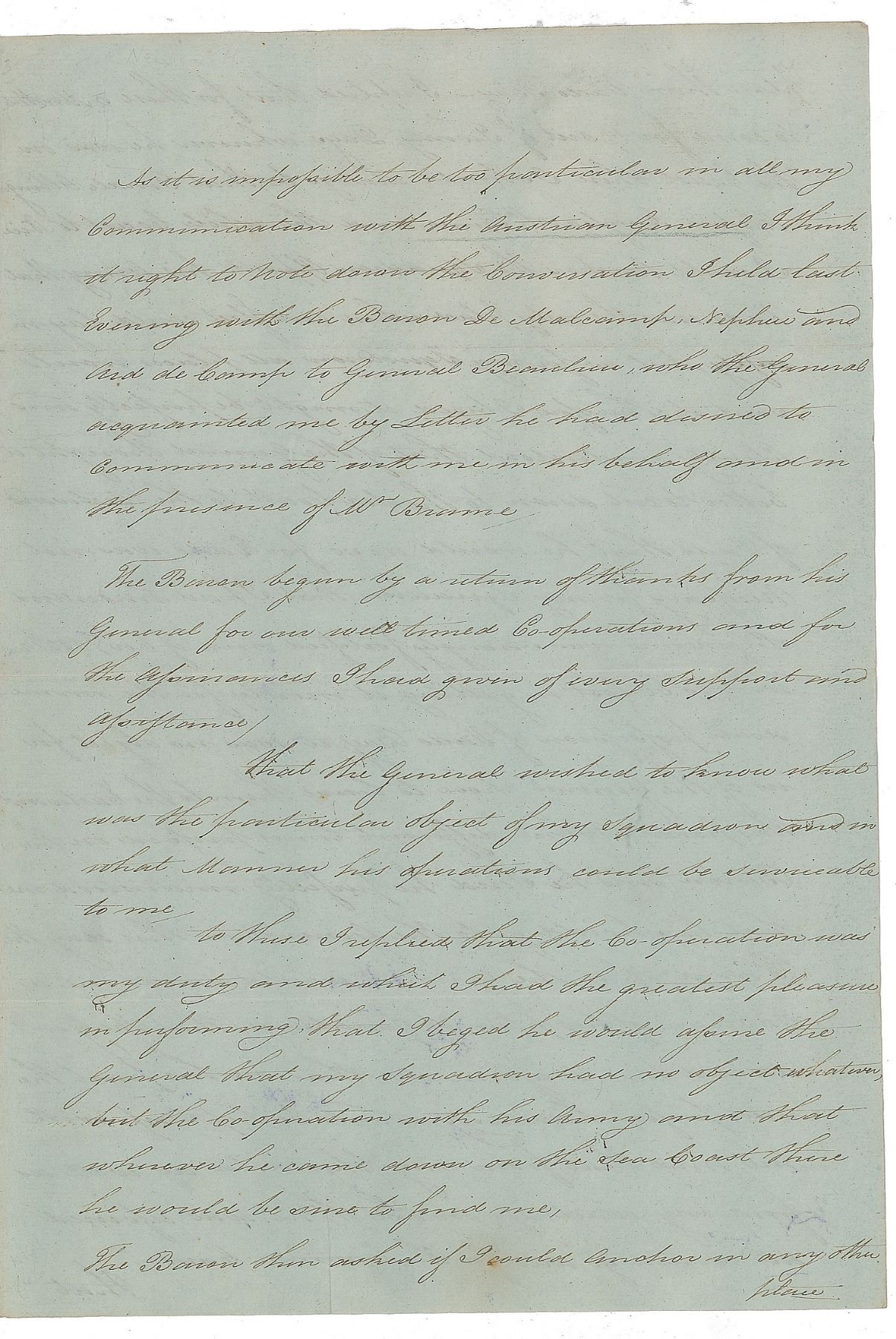 The Baron assured Nelson that "the General would send me a tableaux of his plan of operations, that the General desired…[that] the most perfect harmony would be kept up with me, and that from my character as well as from my exactness…he was assured all would go well for the common cause…[and] that our enemies should be convinced of the most perfect harmony subsisting between the Allies."