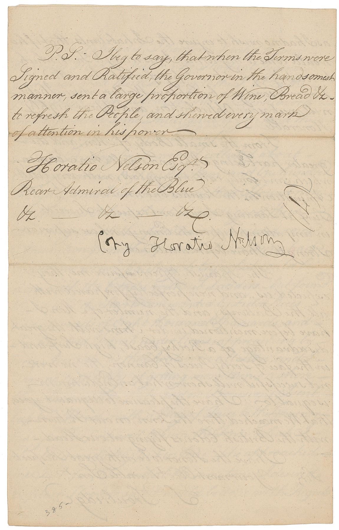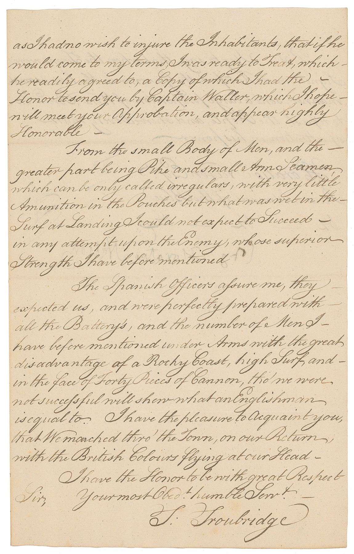 LS endorsed at the conclusion, "Copy Horatio Nelson," four pages on two adjoining sheets, 8 x 12.5, July 25, 1797. An important manuscript copy of Captain Thomas Troubridge's account describing his attack on Santa Cruz, dated on board the HMS Culloden on the day of the battle. In part: "From the darkness of the Night, I did not immediately hit the mole, the Spot appointed to land, but push'd on Shore under the Enemy's Battery's, close to the Southward of the Citadel…I immediately push'd with Captain Waller for the Square, the Place of Rendezvous, in hopes of there meeting you…The Ladders being all Lost in the Surf or not to be found no immediate attempt could be made on the Citadel…I endeavour'd then to procure some Intelligence of you, and the rest of the officers without Success…By day break we had collected about Eighty marines, Eighty Pike Men, and One hundred & Eighty small Arm Seamen, these I found were all that were alive, that had made good their Landing…having procured some Amunition from the Spanish Prisoners we had made, we were Marching to try what could be done with the Citadel without Ladders…but found…upwards of Eight thousand Spaniards, and One hundred French under Arms, approaching by every Avenue; as the boats were all Stove, and I saw no possibility of getting more men on shore, the Ammunition wet, and no Provisions, I sent Captain Hood with a Flag of Truce to the Governor, to say I was prepared to burn the Town…at the same time, I desired Captain Hood to say, it would be done with Regret, as I had no wish to injure the Inhabitants, that if he would come to my terms, I was ready to Treat, which he readily agreed to…From the small Body of Men, and the greater part being Pike and small Arm Seamen, which can be only called irregulars, with very little Ammunition in the Pouches but what was wet in the Surf at Landing, I could not expect to Succeed in any attempt upon the Enemy, whose superior Strength I have before mentioned. The Spanish officers assure me, they expected us, and were perfectly prepared with all the Battery's, and the number of Men I have before mentioned under Arms with the great disadvantages of a Rocky Coast, high Surf, and in the face of Forty Pieces of Cannon, tho' we were not successful will shew what an Englishman is equal to. I have the pleasure to acquaint you, that We marched thro' the Town, on our Return, with the British Colours flying at our Head." Signed at the conclusion by Nelson, now forced to use his left hand, to certify it as an official copy to retain for his own records. Troubridge's original report is now in the Royal Navy College at Greenwich, England. In fine condition.