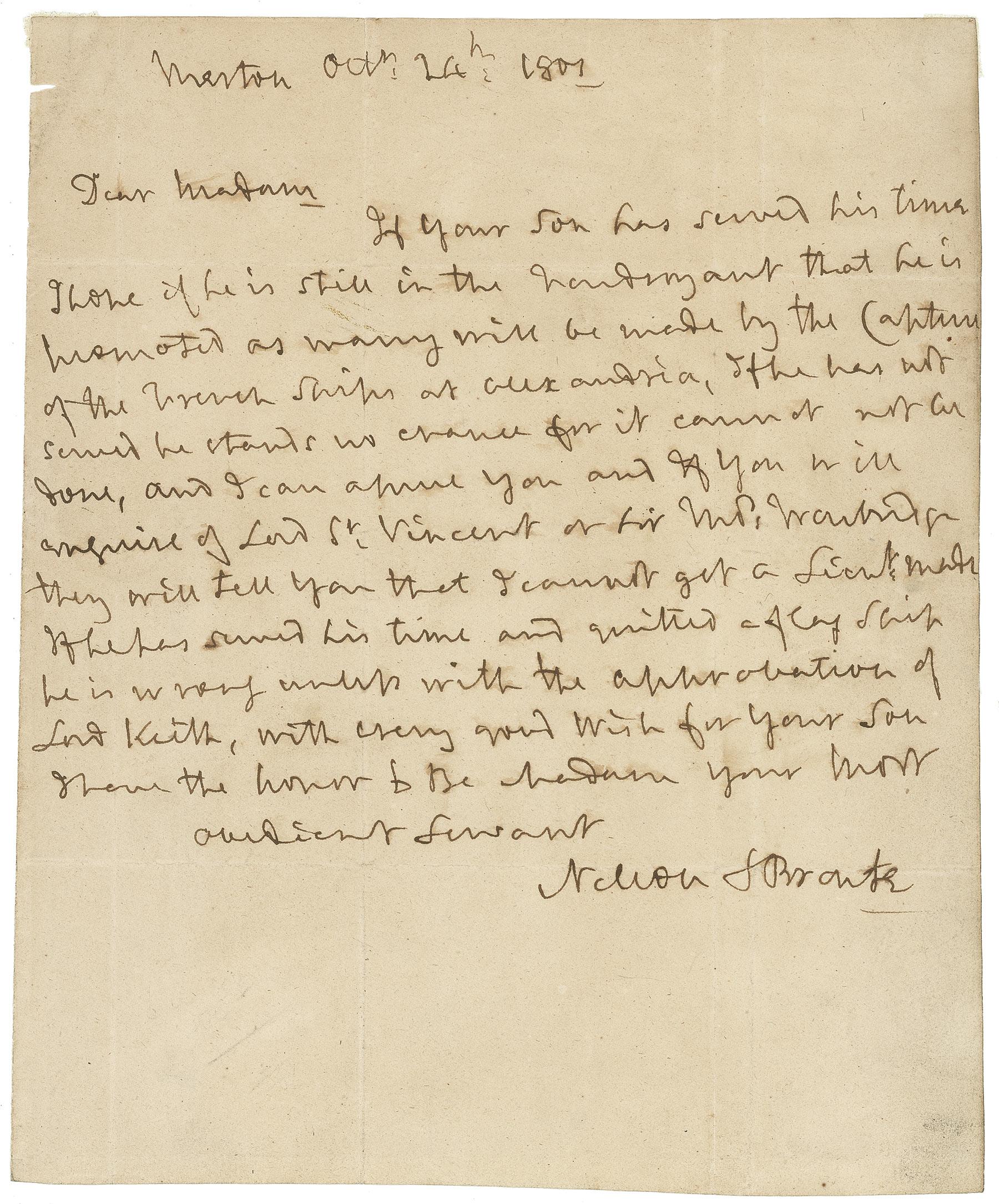 Highly esteemed British admiral (1758–1805) best known for his participation in the Napoleonic Wars, during which, in the Battle of Trafalgar, he lost his life. ALS signed “Nelson & Bronte,” one page, 7.25 x 9, October 24, 1801. Letter to Lady Collier. In full: “If your son has served his time I hope if he is still in the Foudroyant that he is promoted as many will be made by the Capture of the French ships at Alexandria, If he has not served he stands no chance for it cannot…be done, and I can assure you…will enquire of Lord St Vincent or Sir Tho[ma]s Troubridge they will tell you that I cannot get a Lieut. made. If he has served his time and quitted a flag ship he is wrong…with the approbation of Lord Keith.” In very good condition, with intersecting folds, one horizontal fold through signature, a uniform shade of mild toning, a bit of scattered soiling, two tape remnants to reverse, and lightly trimmed edges. Accompanied by the original mailing panel, addressed in Nelson’s hand.
