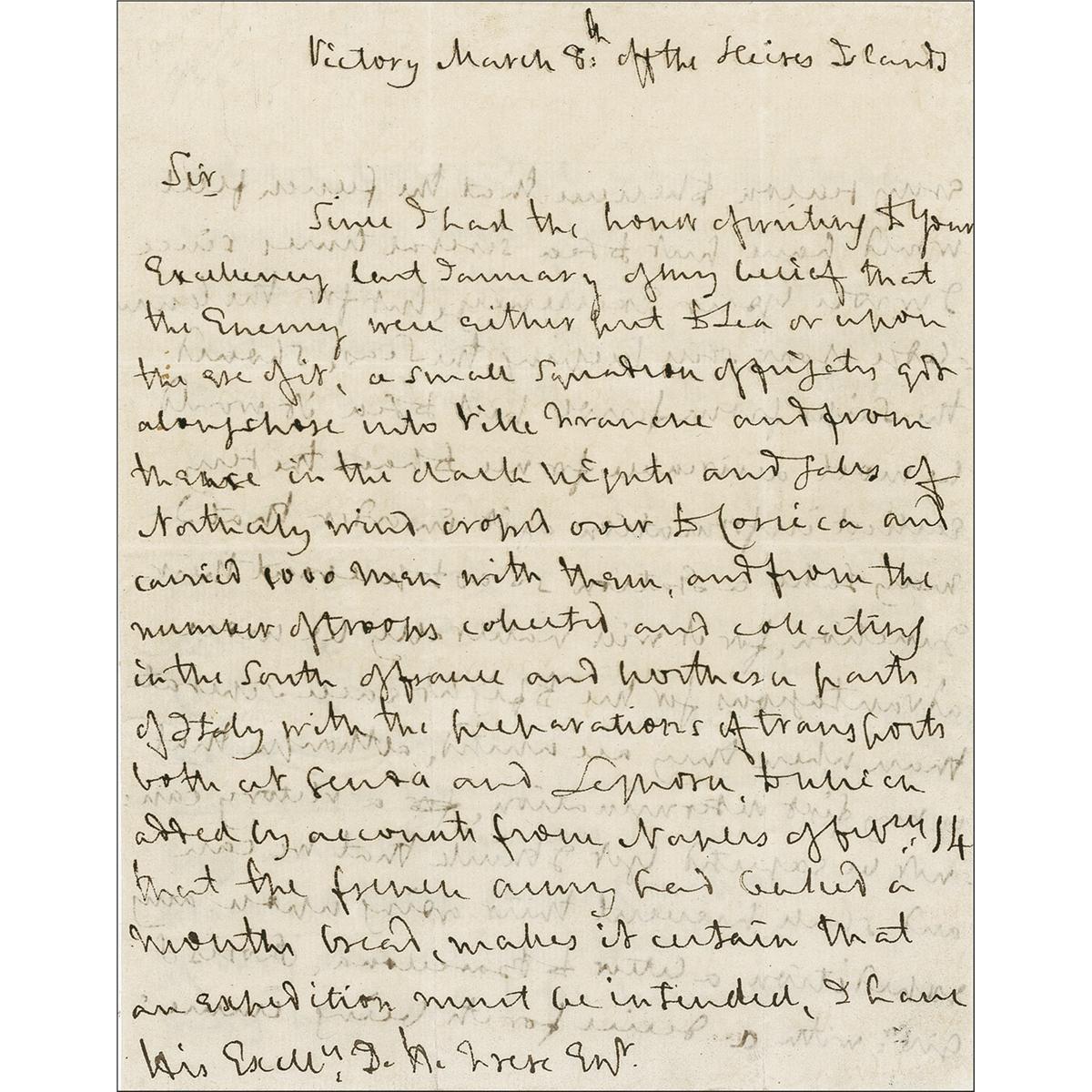 In this letter, Nelson realizes that the French are preparing to set sail and talks of attacking before they can combine forces. “It naturally will be more advantageous for me to fight each separate than when they are united...I think that we can and shall prevent their going upon any expedition,” the British admiral explains. Nelson was continuously striving to find ways to defeat the enemy. His main objective was ‘to keep the French fleet in check and if they put to sea to annihilate them.’ It was his fear that the French would slip away from the Mediterranean and join a larger naval concentration in the Atlantic, giving Napoleon control of the English Channel and paving the way for the invasion of England.
