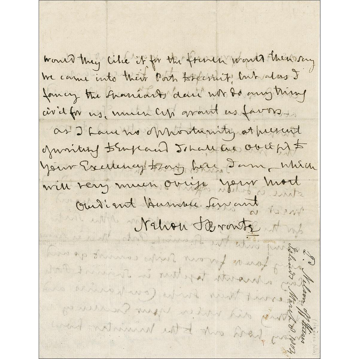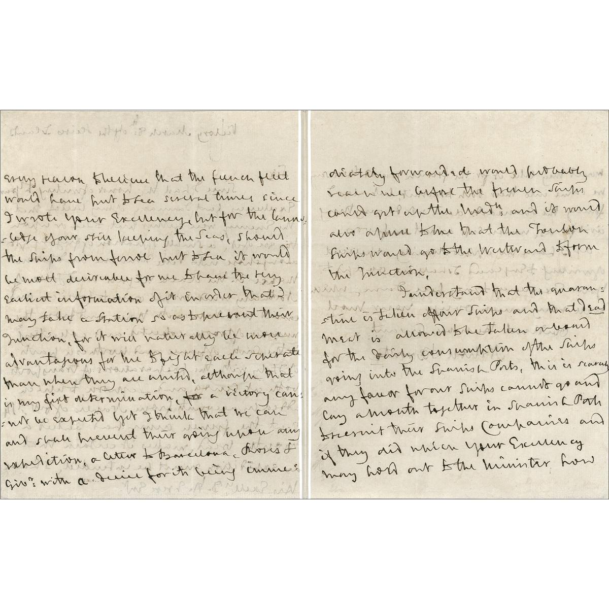 ALS signed “Nelson & Bronte,” four pages on two adjoining sheets, 7.5 x 9.5, March 8, 1804. Letter to J. H[ookham] Friere, England’s Ambassador to the Court of Spain at Madrid, written aboard his ship Victory while off the Hieres Islands. In full: “Since I had the honor of writing to your Excellency last January of my belief that the Enemy were either put to sea or upon the eve of it, a small squadron of Frigates got along shore into Ville Franche and from there in the dark nights and gales of Northerly wind crossed over to Corsica and carried 1000 men with them, and from the number of troops collected and collecting in the South of France and northern parts of Italy, with the preparations of transports both at Genoa and Leghorn, to which added by accounts from Naples of February 14 that the French army had baked a months bread, makes it certain that an expedition must be intended. I have every reason to believe that the French fleet would have put to sea several times since I wrote your Excellency, but for the knowledge of our still keeping the Seas. Should the ships from Ferrol put to sea it would be most desirable for me to have the earliest information of it in order that I may take a station so as to prevent their Junction, for it naturally will be more advantageous for me to fight each separate than when they are united. Although that is my first determination, a victory cannot be expected yet I think that we can and shall prevent their going upon any expedition. A letter to Barcelona, Roses & Gibraltar with a desire for it being immediately forwarded would probably reach me before the French ships could get up the Mediterranean and it would also apprise to me that the Toulon ships would go to the Westward to form the Junction.