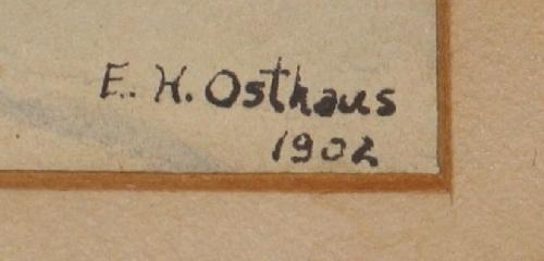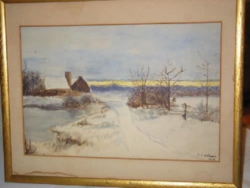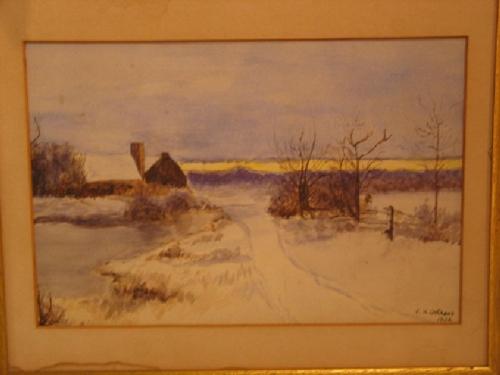 Osthaus, Edmund Henry (American, 1858-1928). Horizon through Winter Snow, /s/ l.r., 1902. Unframed watercolor on paper, slight water damage to bottom left of matte, Labels verso, "American Express Co., Holyoke, Mass", "National Blank Book Co, Holyoke, Mass", and American Express Co.8 1/2" by 12"