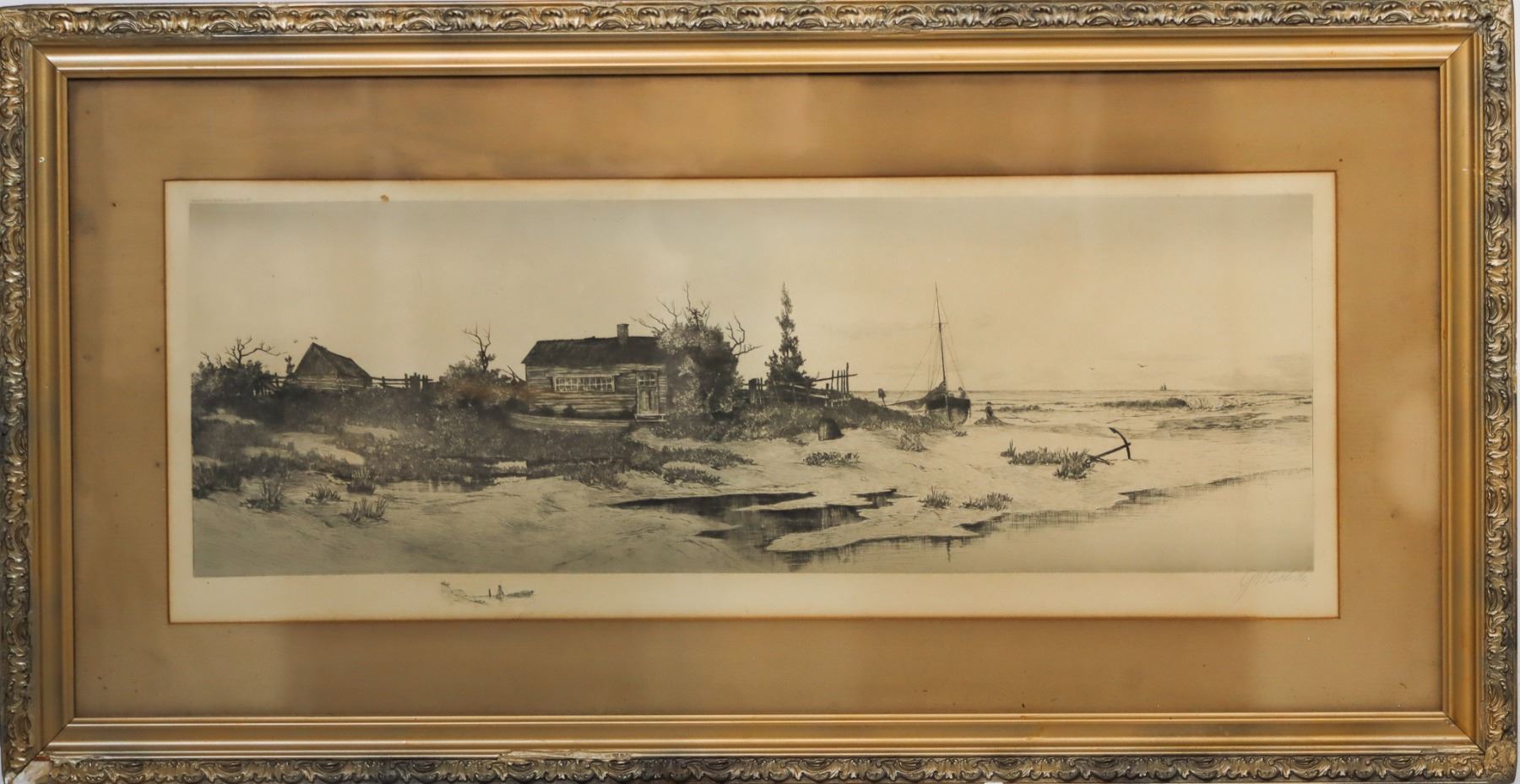 Beautiful image of the coastal shore, unnumbered etching, indistinctly signed in pencil in the margin, framed.