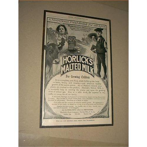 Horlick's Malted Milk Framed Dated 1904. It says Horlick's Food company Racing, Wis. USA. London, Eng, 1873-1904 Montreal, Canada. Back says, This is not a reproduction, it is an original Printing of its era, and only increase in value with time. The handcrafted frame is designed to complement the subject. HARVEY'S WALLHANGER'S IRVINE, CA 92714 DATED 1904. It is in a glass metal frame and is all black and white. Really in very nice condition and shows age well. It was well taken care of. Came out of a great estate where almost everything was about 100 years old, or older. A great find for any collector who collects items like this. It is 9 1/8" H X 6" W. The photos say it all. Any questions or info or photos needed, just e-mail us. Thanks and good luck to the lucky one who gets it.