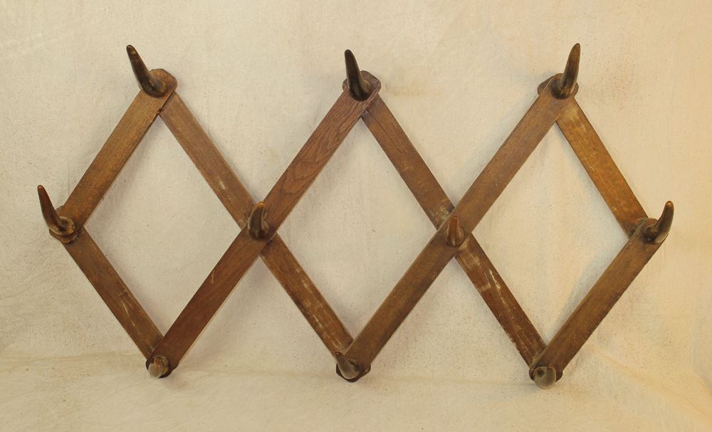 Interesting accordian style expanding coat rack with 10 longhorn hooks.