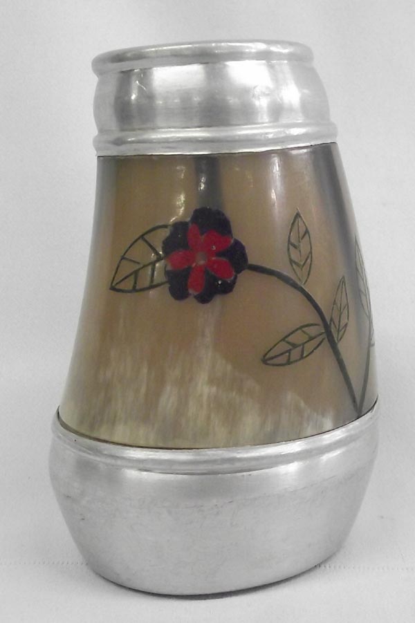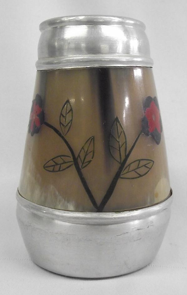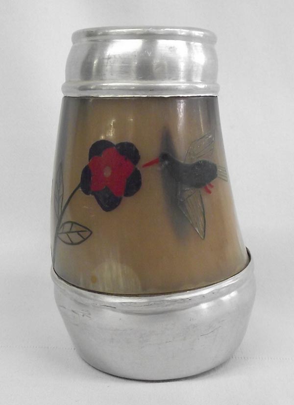 Horn Tumbler. Decorated with flowers and hummingbird. Measures approx. 4.25''H x 2 1/2''Diameter. metal top and bottom. Buyers Pay Actual Shipping and Handling Charges(see terms and conditions for more information).