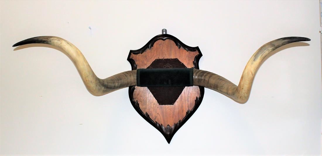 Oustanding 51" wide set of horns mounted on ornate walnut wall plaque with spectacular color and twist.